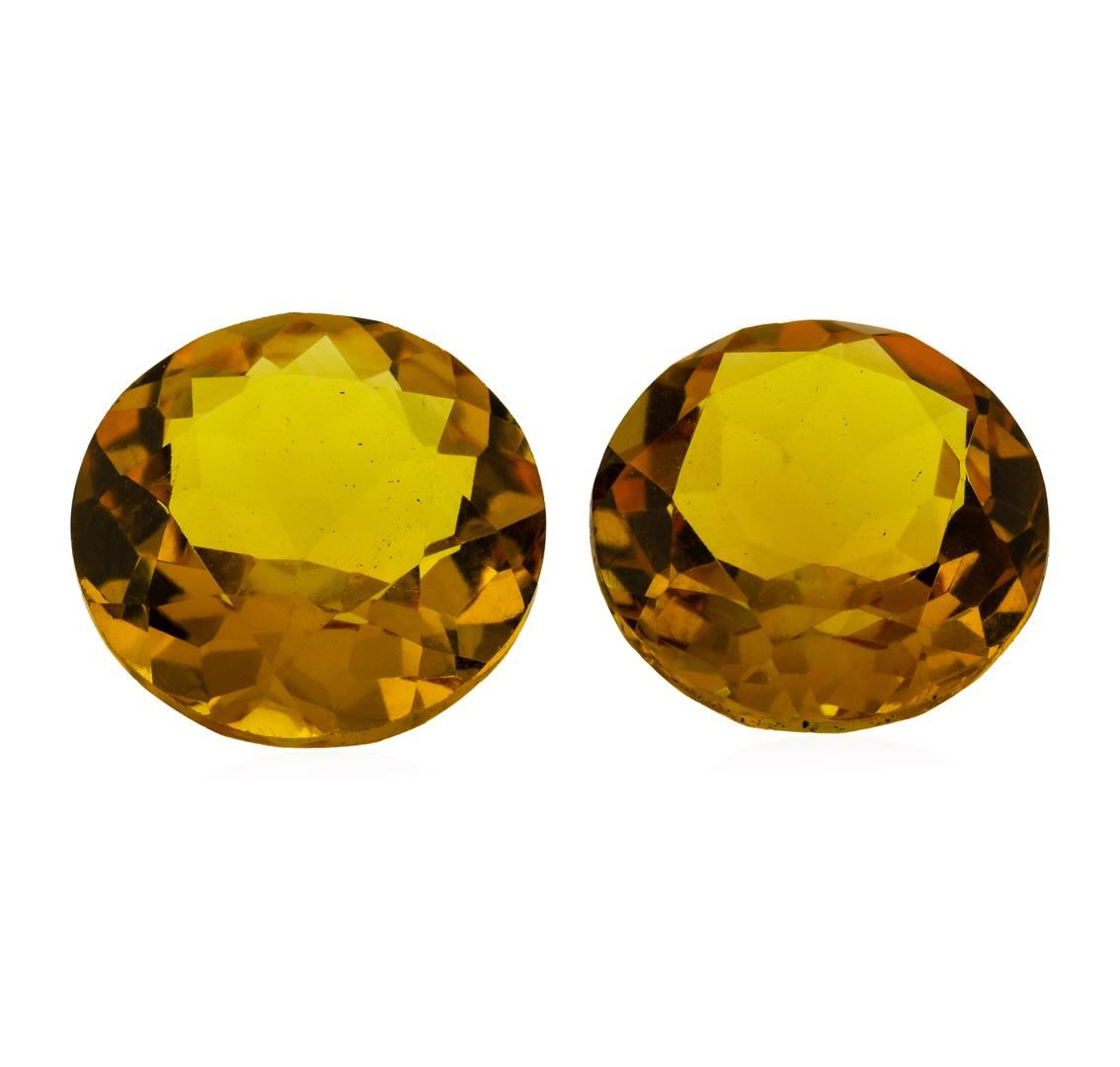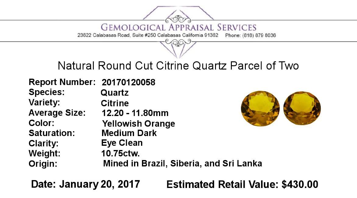 One natural round cut citrine quartz parcel of two with an exact weight of 10.75ctw., clarity is eye clean, yellowish orange, medium dark. Gemological Appraisals Services estimates the retail value at $430 GAS Appraised.