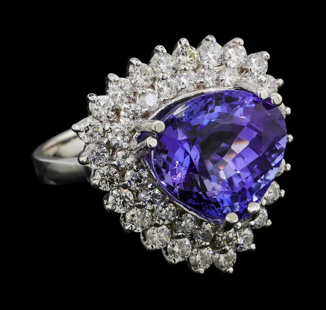 One electronically tested 14KT white gold lady's cast fashion ring with a double basket halo with a bright polish finish. The featured lady's ring has a shank measuring 2.54 millimeters wide. Identified with markings of 'K14'. Condition is new, good workmanship. Containing: One prong set pear modified brilliant cut natural tanzanite, measuring 12.25 x 13.75 x 9.53mm, (depth est.) approximate weight of 10.76ct., clarity is eye clean, medium, moderately strong, violetish blue color, (GIA vB 5/4), cut is very good. Transmitting light with no distortion, transparent. Colored gemstones are presumed to have been subjected to commonly used enhancement processes. Graded in the setting. Twenty-Four prong set round brilliant cut diamonds, measuring 2.40 - 2.30 x 1.46mm (depth est.) approximate total weight of 24 Stones = 1.17ct. Graded in the setting. Clarity SI-1 to I-1. Color: G - H Cut Very Good Twenty-One prong set round brilliant cut diamonds, measuring 2.10 - 2.00 x 1.25mm (depth est.) approximate total weight of 21 Stones = 0.68ct. Graded in the setting. Clarity SI-1 to I-1. Color: G - H Cut Good. Total Weight of Colored Stones 10.76ct.. Total Weight of Diamonds 1.85ct.. Total Weight of Ring 10.20gm. GAS Appraised at $18,905.00.