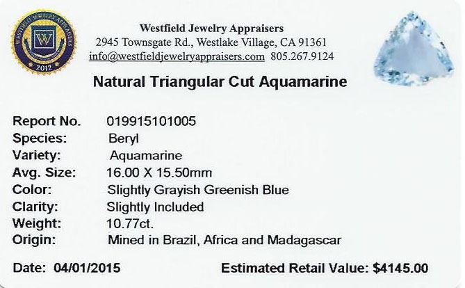 One triangle cut natural aquamarine exact weight 10.77ct., clarity is slightly included, type I, medium, very slightly grayish, very slightly greenish blue color, (GIA vslgB 5/3), cut is good. Westfield Appraised at $4,145.00.
