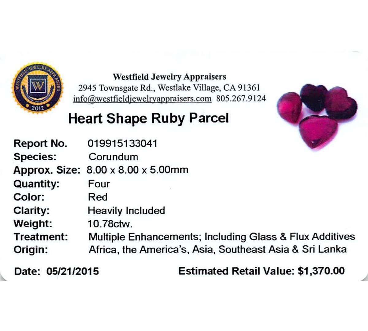 Four heart mixed cut natural rubies, measuring 8.00 x 8.00 x 5.00mm, exact total weight 10.78ct., clarity is heavily included, type II, dark, very slightly brownish, red color, (GIA R 7/3), cut is good. Measurements are an average for the group. Transmitting light somewhat diffusely, transparent to translucent. Naturally occurring internal & external characteristics are present. Indications of laboratory high temperature heat treatment, with glass & flux additives. Ruby has a low tolerance to rhodium plating, repolishing the surface, & ultrasonic cleaning. Westfield Appraised at $1,370.00.