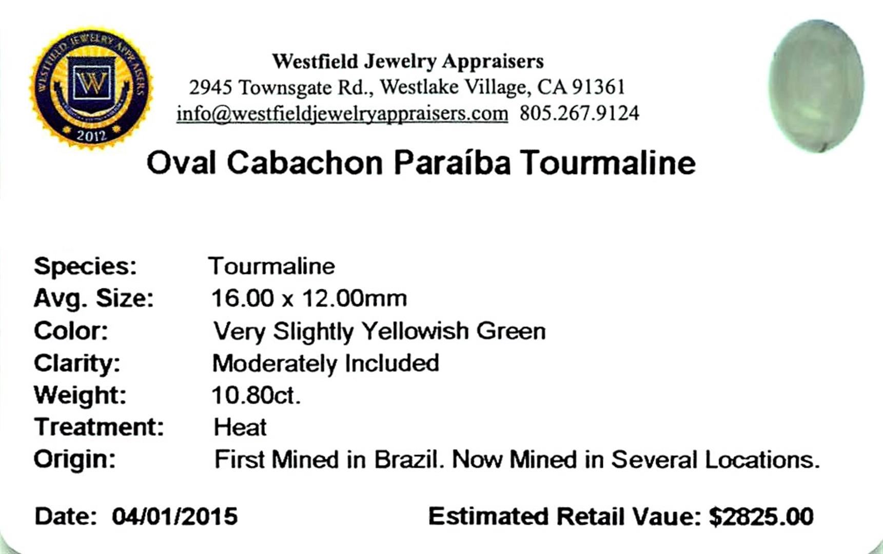 One oval cabochon cut natural Paraiba tourmaline exact weight 10.80ct., clarity is moderately included, cut is good. Westfield Appraised at $2,825.00.