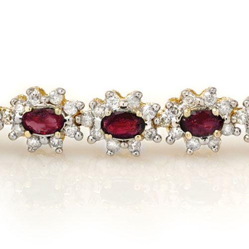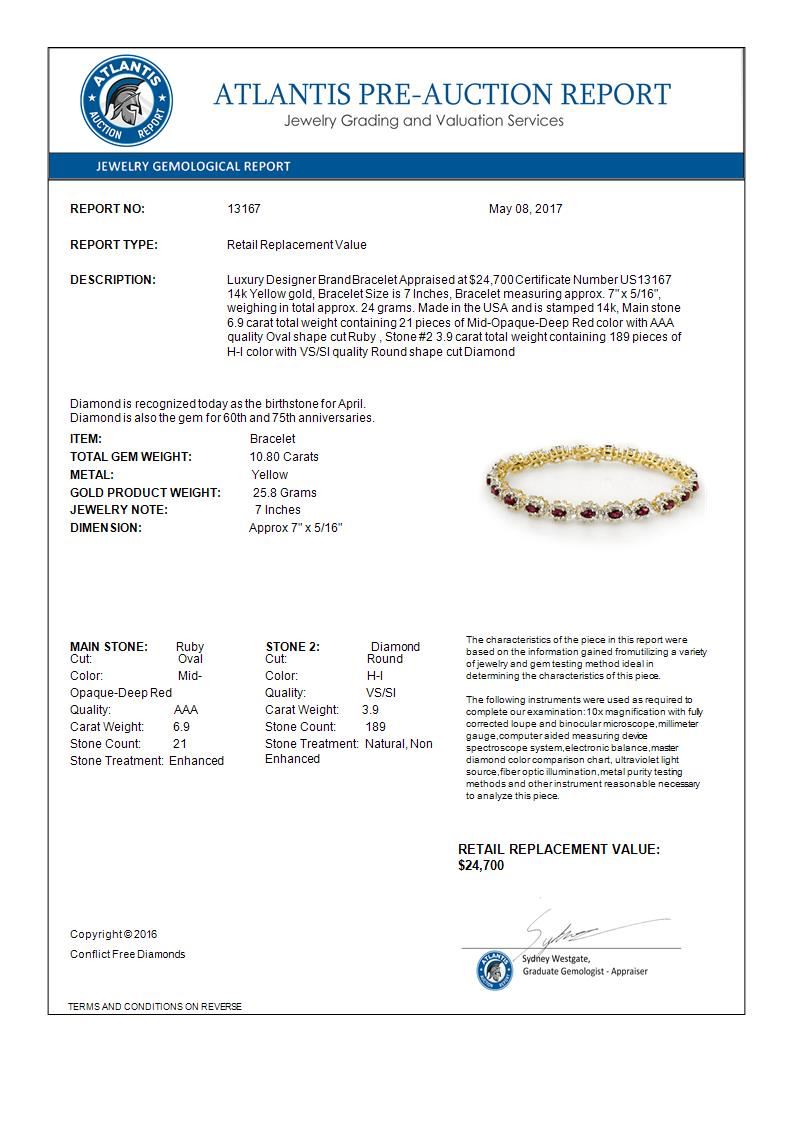 10.80 CTW Ruby & Diamond Bracelet 14K Yellow Gold ---- Luxury Designer Brand Bracelet Appraised Retail Price at $24,700 ---- SKU Number US13167 14k Yellow gold Bracelet Size is 7 Inches, Bracelet measuring approx. 7" x 5/16", weighing in total approx. 24 grams. Made in the USA and is stamped 14k, Main stone 6.9 carat total weight containing 21 pieces of Mid-Opaque-Deep Red color with AAA quality Oval shape cut Ruby , Stone #2 3.9 carat total weight containing 189 pieces of H-I color with VS/SI quality Round shape cut