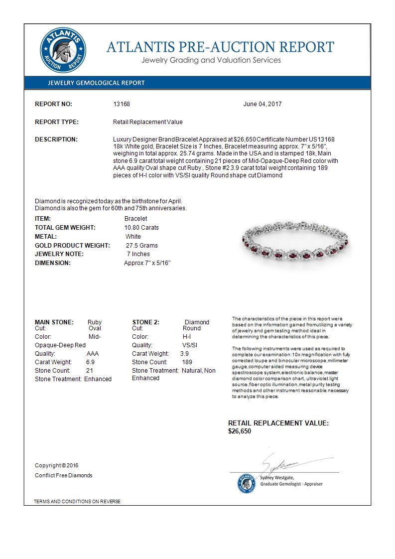 10.80 CTW Ruby & Diamond Bracelet 18K White Gold ---- Luxury Designer Brand Bracelet Appraised Retail Price at $26,650 ---- SKU Number US13168 18k White gold Bracelet Size is 7 Inches, Bracelet measuring approx. 7" x 5/16", weighing in total approx. 25.74 grams. Made in the USA and is stamped 18k, Main stone 6.9 carat total weight containing 21 pieces of Mid-Opaque-Deep Red color with AAA quality Oval shape cut Ruby , Stone #2 3.9 carat total weight containing 189 pieces of H-I color with VS/SI quality Round shape cut