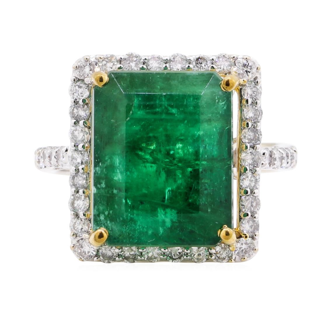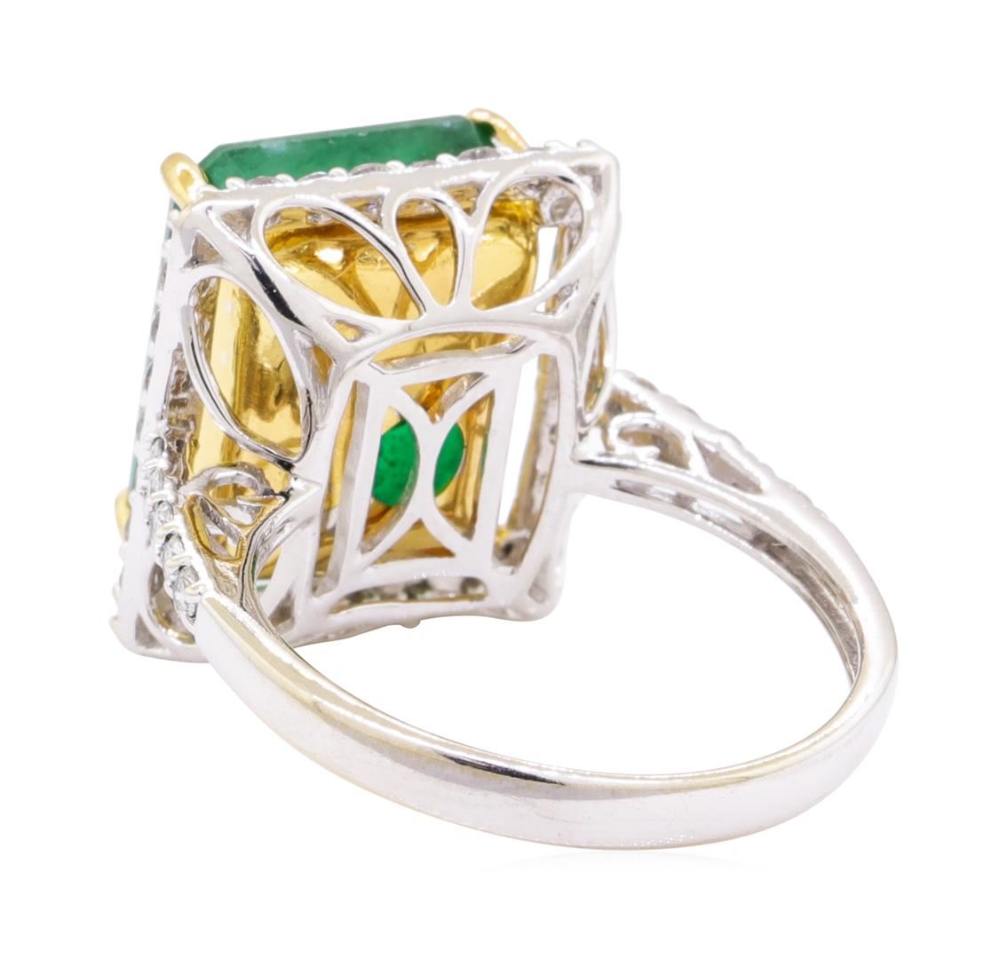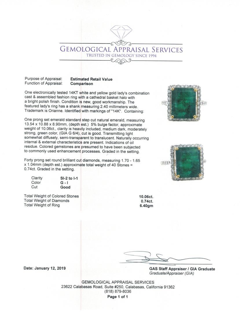 One electronically tested 14KT white and yellow gold lady's combination cast & assembled fashion ring with a cathedral basket halo with a bright polish finish. The featured lady's ring has a shank measuring 2.40 millimeters wide. Trademark is Orianne. Identified with markings of '14K'. Condition is new, good workmanship. Containing: One prong set emerald standard step cut natural emerald, measuring 13.54 x 10.88 x 8.90mm, (depth est.) 5%. bulge factor, approximate weight of 10.06ct., clarity is heavily included, medium dark, moderately strong, green color, (GIA G 6/4), cut is good. Transmitting light somewhat diffusely, semi-transparent to translucent. Naturally occurring internal & external characteristics are present. Indications of oil residue. Colored gemstones are presumed to have been subjected to commonly used enhancement processes. Graded in the setting. Forty prong set round brilliant cut diamonds, measuring 1.70 - 1.65 x 1.04mm (depth est.) approximate total weight of 40 Stones = 0.74ct. Graded in the setting. Color G - I Clarity SI-2 to I-1 Cut Good. Total Weight of Colored Stones 10.06ct.. Total Weight of Diamonds 0.74ct.. Total Weight of Ring 6.40gm GAS Appraised at $16080.00. GAS Appraised at $16,080.00.