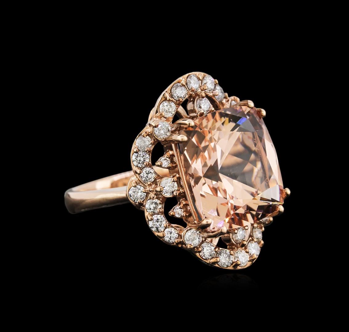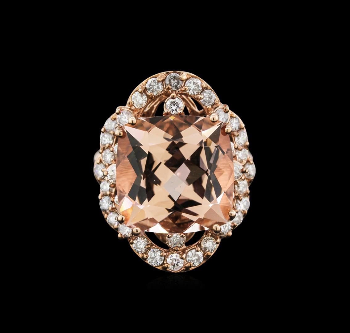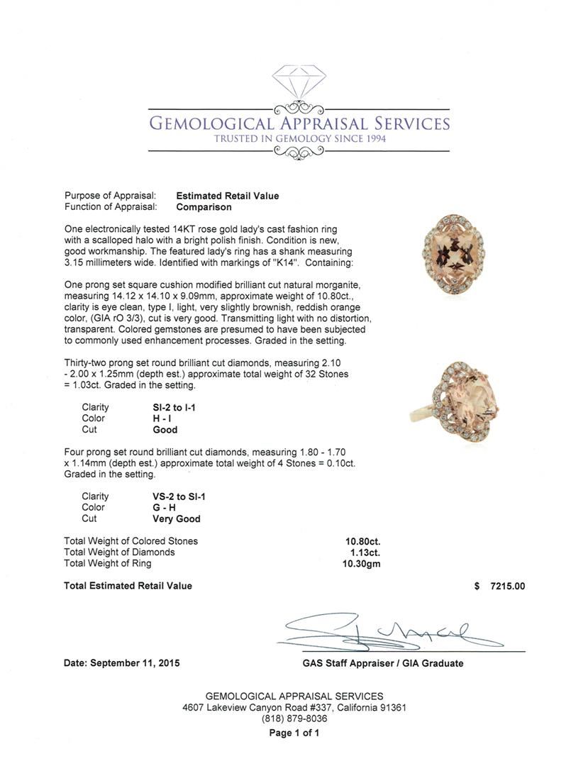 One electronically tested 14KT rose gold lady's cast fashion ring with a scalloped halo with a bright polish finish. The featured lady's ring has a shank measuring 3.15 millimeters wide. Identified with markings of "K14". Condition is new, good workmanship. Containing: One prong set square cushion modified brilliant cut natural morganite, measuring 14.12 x 14.10 x 9.09mm, approximate weight of 10.80ct., clarity is eye clean, type I, light, very slightly brownish, reddish orange color, (GIA rO 3/3), cut is very good. Transmitting light with no distortion, transparent. Colored gemstones are presumed to have been subjected to commonly used enhancement processes. Graded in the setting. Thirty-Two prong set round brilliant cut diamonds, measuring 2.10 - 2.00 x 1.25mm (depth est.) approximate total weight of 32 Stones = 1.03ct. Graded in the setting. Clarity: SI-2 to I-1. Color: H - I. Cut Good Four prong set round brilliant cut diamonds, measuring 1.80 - 1.70 x 1.14mm (depth est.) approximate total weight of 4 Stones = 0.10ct. Graded in the setting. Clarity: VS-2 to SI-1. Color: G - Very Good. Total Weight of Colored Stones 10.80ct. Total Weight of Diamonds 1.13ct. Total Weight of Ring 10.30gm. GAS Appraised at $7,215.00.