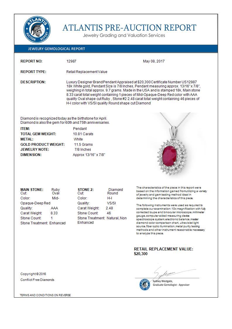 10.81 CTW Ruby & Diamond Pendant 18K White Gold ---- Luxury Designer Brand Pendant Appraised Retail Price at $20,300 ---- SKU Number US12987 18k White gold Pendant Size is 7/8 Inches, Pendant measuring approx. 13/16" x 7/8", weighing in total approx. 9.7 grams. Made in the USA and is stamped 18k, Main stone 8.33 carat total weight containing 1 pieces of Mid-Opaque-Deep Red color with AAA quality Oval shape cut Ruby , Stone #2 2.48 carat total weight containing 46 pieces of H-I color with VS/SI quality Round shape cut