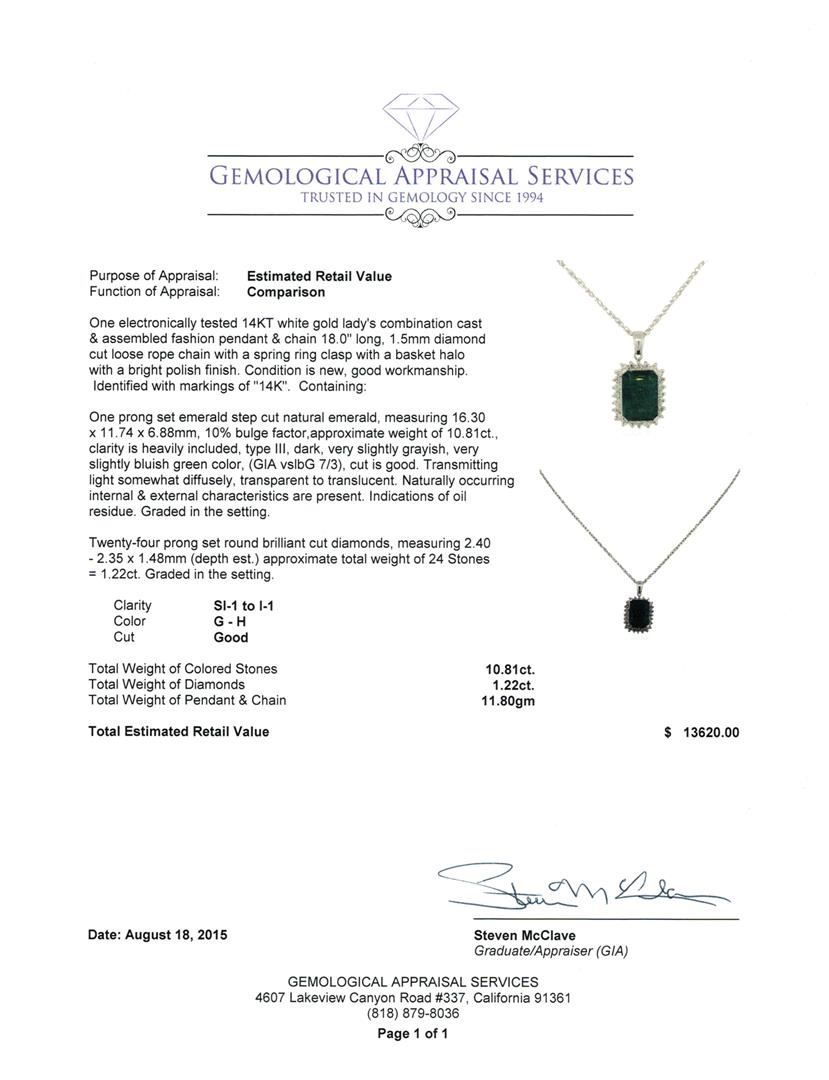 One electronically tested 14KT white gold lady's combination cast & assembled fashion pendant & chain 18.0" long, 1.5mm diamond cut loose rope chain with a spring ring clasp with a basket halo with a bright polish finish. Identified with markings of "14K". Condition is new, good workmanship. Containing: One prong set emerald step cut natural emerald, measuring 16.30 x 11.74 x 6.88mm, 10% bulge factor, approximate weight of 10.81ct., clarity is heavily included, type III, dark, very slightly grayish, very slightly bluish green color, (GIA vslbG 7/3), cut is good. Transmitting light somewhat diffusely, transparent to translucent. Naturally occurring internal & external characteristics are present. Indications of oil residue. Graded in the setting. Twenty-Four prong set round brilliant cut diamonds, measuring 2.40 - 2.35 x 1.48mm (depth est.) approximate total weight of 24 Stones = 1.22ct. Graded in the setting. Clarity: SI-1 to I-1. Color: G - H. Cut Good. Total Weight of Colored Stones 10.81ct. Total Weight of Diamonds 1.22ct. Total Weight of Pendant & Chain 11.80gm. GAS Appraised at $13,620.00.