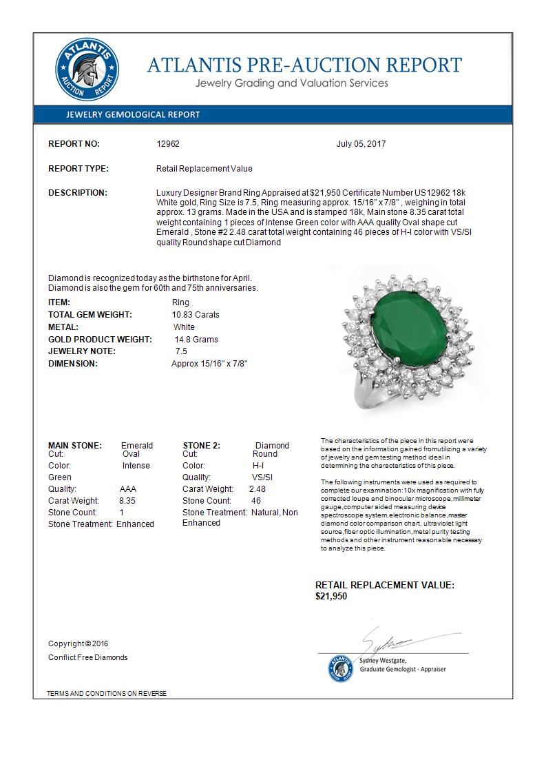10.83 CTW Emerald & Diamond Ring 18K White Gold ---- Luxury Designer Brand Ring Appraised Retail Price at $21,950 ---- SKU Number US12962 18k White gold Ring Size is 7.5, Ring measuring approx. 15/16" x 7/8" , weighing in total approx. 13 grams. Made in the USA and is stamped 18k, Main stone 8.35 carat total weight containing 1 pieces of Intense Green color with AAA quality Oval shape cut Emerald , Stone #2 2.48 carat total weight containing 46 pieces of H-I color with VS/SI quality Round shape cut