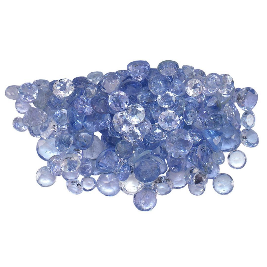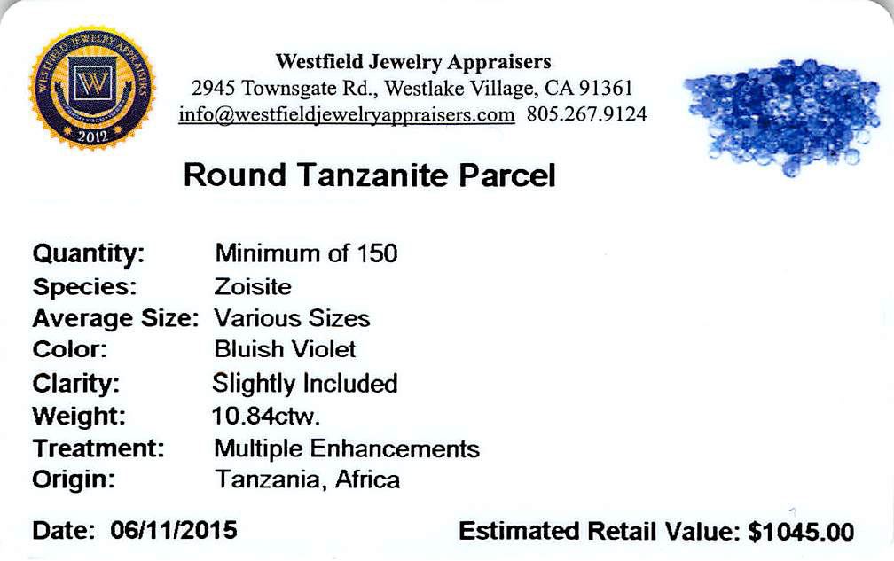 One hundred fifty round mixed cut natural tanzanites exact total weight 10.84ct., clarity is eye clean, type I, medium dark, very slightly grayish, bluish violet color, (GIA bV 6/3), cut is good. Transmitting light with no distortion, transparent. Color grade is an average for the group. Graded in the setting. Tanzanite is a very rare gemstone that is only found in the country of Tanzania. Originally discovered in 1967. Tiffany & Company, named the stone Tanzanite. It is found in the Usumburu Mountains that border the Umba Valley of northern Tanzania. Tanzanite occurs in gray, brown, violet, blue, reddish-purple, & green. The gem is interesting because of its exceptional pleochroism. Rotated in different directions a tanzanite will exhibit multiple changes of color. Tanzanite has a low tolerance to ultrasonic cleaning, and should not be cleaned using this method. Westfield Appraised at $1,045.00.