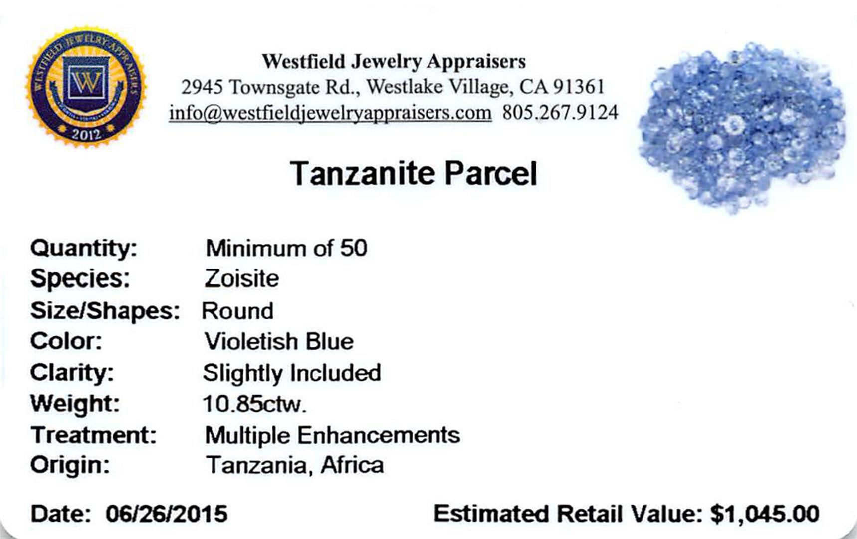 Fifty round mixed cut natural tanzanites, measuring 2.00 - 2.00 x 1.30 mm, exact total weight 10.85ct., clarity is slightly included, type I, medium light, very slightly grayish, violetish blue color, (GIA vB 4/3), cut is good. Measurements & the color grade are an average for the group, Color grade is an average for the group, Transmitting light with no distortion, transparent, Naturally occurring internal & external characteristics are present, Indications of multiple laboratory enhancements, including high temperature heat treatment. Westfield Appraised.