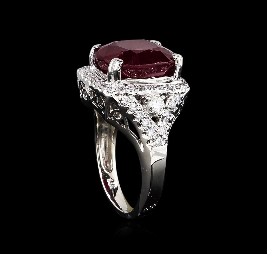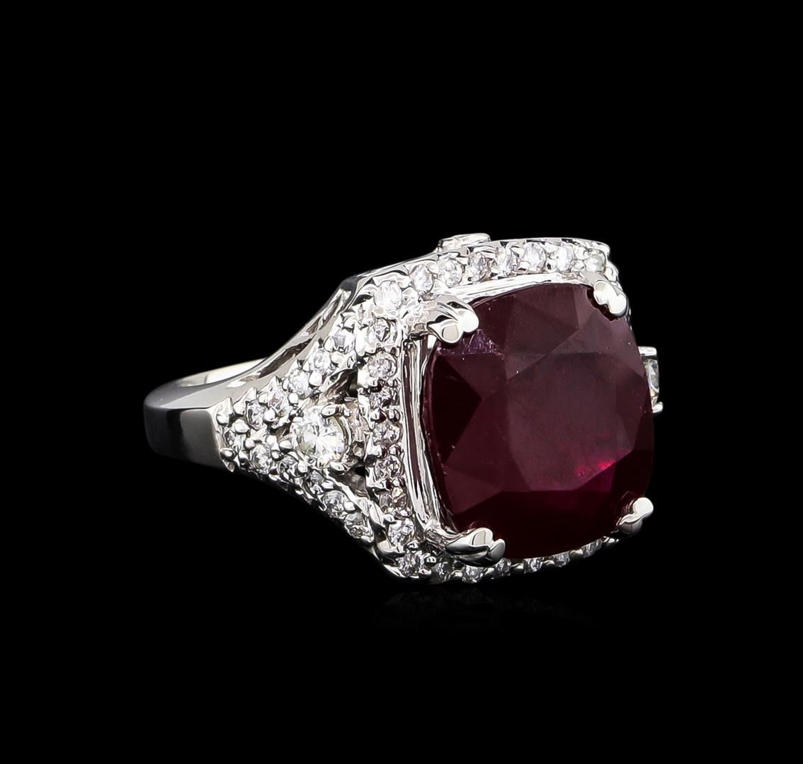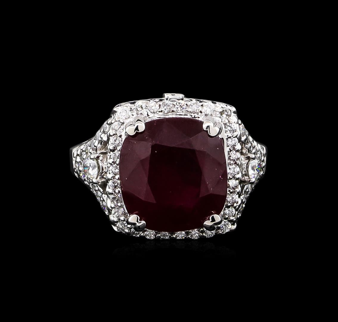 One electronically tested 14KT white gold lady's cast fashion ring with a cathedral split shank with a bright polish finish. The featured lady's ring has a shank measuring 2.72 millimeters wide. Identified with markings of "14K". Condition is new, good workmanship. Containing: One prong set rectangular cushion modified brilliant cut natural ruby, measuring 12.43 x 11.72 x 7.45mm, 6%. bulge factor, approximate weight of 10.85ct., clarity is heavily included, type II, medium dark, very slightly brownish, slightly purplish red color, (GIA slpR 6/3), cut is very good. Transmitting light somewhat diffusely, semi-transparent to translucent. Naturally occurring internal & external characteristics are present. Indications of laboratory high temperature heat treatment, with glass & flux additives. Graded in the setting. Two prong set round brilliant cut diamonds, measuring 2.95 - 2.90 x 1.76mm (depth est.) approximate total weight of 2 Stones = 0.18ct. Graded in the setting. Clarity: SI-2 to I-1. Color: Good Fifty-Four prong set round brilliant cut diamonds, measuring 1.50 - 1.40 x 0.91mm (depth est.) approximate total weight of 54 Stones = 0.64ct. Graded in the setting. Clarity: SI-1 to I-1. Color: H - I. Cut Good. Total Weight of Colored Stones 10.85ct. Total Weight of Diamonds 0.82ct. Total Weight of Ring 9.10gm. GAS Appraised at $7,070.00.
