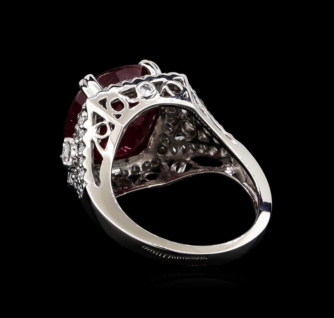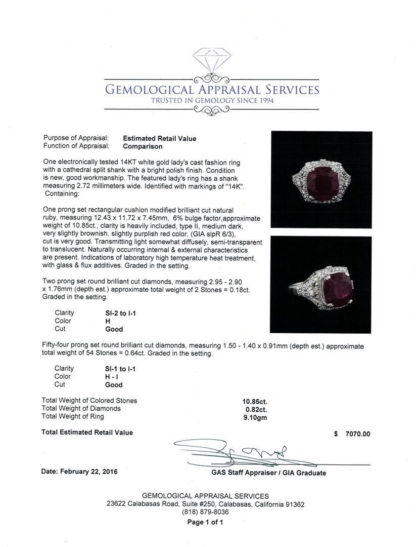 One electronically tested 14KT white gold lady's cast fashion ring with a cathedral split shank with a bright polish finish. The featured lady's ring has a shank measuring 2.72 millimeters wide. Identified with markings of "14K". Condition is new, good workmanship. Containing: One prong set rectangular cushion modified brilliant cut natural ruby, measuring 12.43 x 11.72 x 7.45mm, 6%. bulge factor, approximate weight of 10.85ct., clarity is heavily included, type II, medium dark, very slightly brownish, slightly purplish red color, (GIA slpR 6/3), cut is very good. Transmitting light somewhat diffusely, semi-transparent to translucent. Naturally occurring internal & external characteristics are present. Indications of laboratory high temperature heat treatment, with glass & flux additives. Graded in the setting. Two prong set round brilliant cut diamonds, measuring 2.95 - 2.90 x 1.76mm (depth est.) approximate total weight of 2 Stones = 0.18ct. Graded in the setting. Clarity: SI-2 to I-1. Color: Good Fifty-Four prong set round brilliant cut diamonds, measuring 1.50 - 1.40 x 0.91mm (depth est.) approximate total weight of 54 Stones = 0.64ct. Graded in the setting. Clarity: SI-1 to I-1. Color: H - I. Cut Good. Total Weight of Colored Stones 10.85ct. Total Weight of Diamonds 0.82ct. Total Weight of Ring 9.10gm. GAS Appraised at $7,070.00.