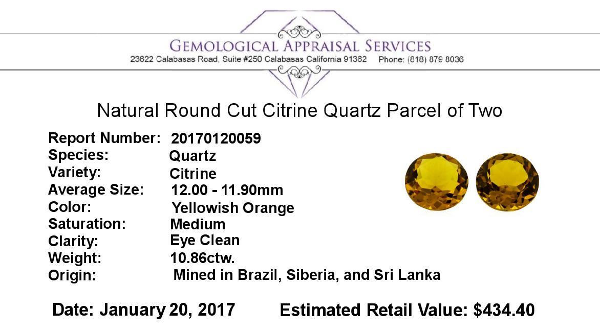 One natural round cut citrine quartz parcel of two with an exact weight of 10.86ctw., clarity is eye clean, yellowish orange, medium. Gemological Appraisals Services estimates the retail value at $434.4 GAS Appraised.