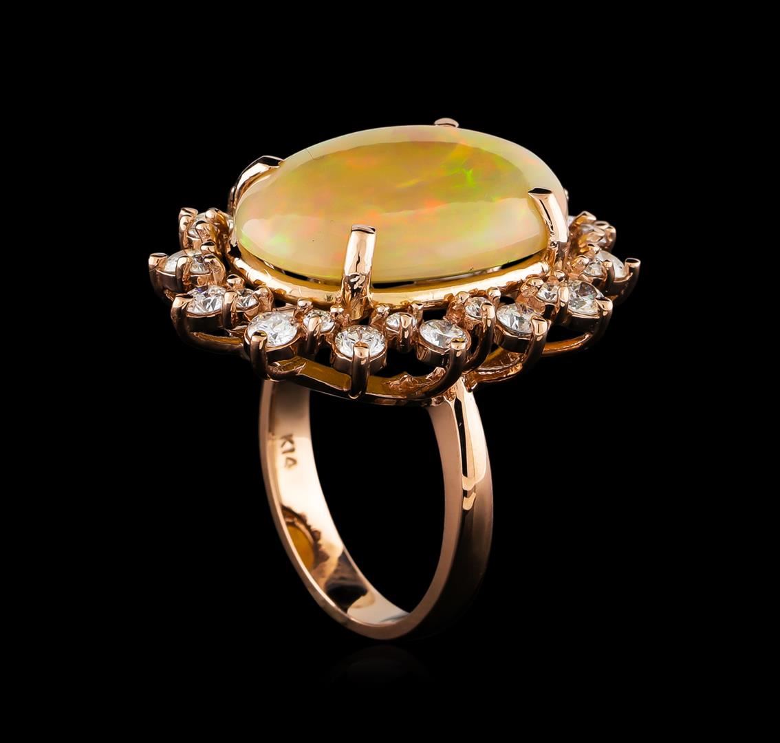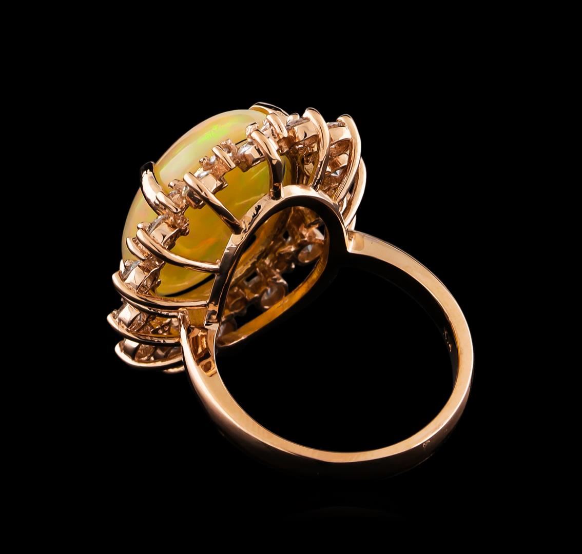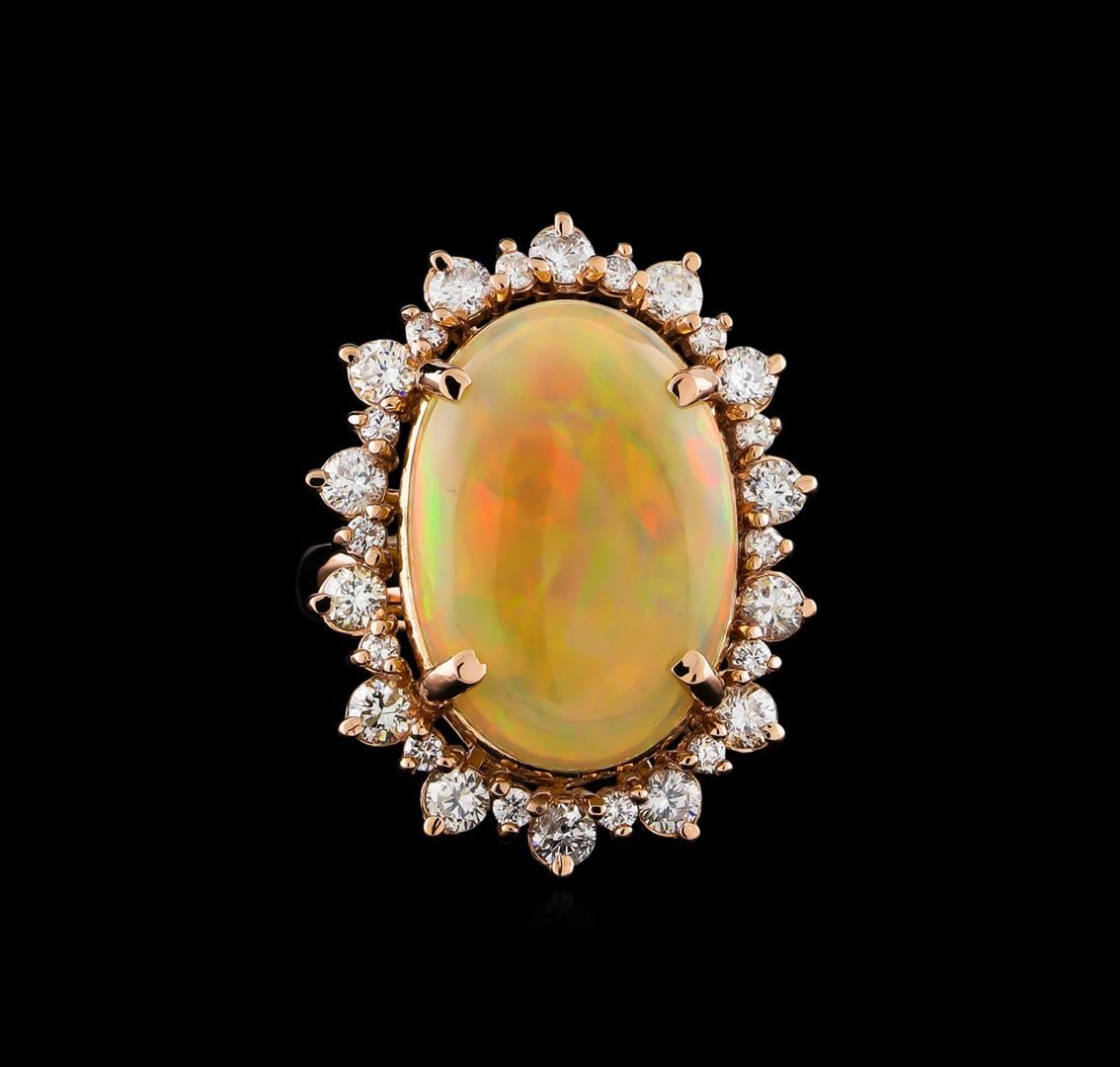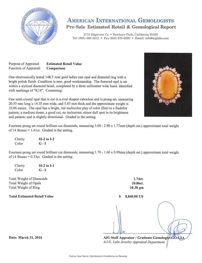 One electronically tested 14KT rose gold ladies cast opal and diamond ring with a bright polish finish. The featured opal is set within a stylized diamond bezel, completed by a three millimeter wide band. Identified with markings of "K14". Condition is new, good workmanship. Containing: One semi crystal opal that is cut in a oval shaped cabochon and is prong set, measuring 20.55 mm long x 14.35 mm wide, and 5.85 mm thick and the approximate weight is 10.86 carats. The opal has a bright, red multicolor play of color (fire) in a flashfire pattern; a medium dome; a good cut; no inclusions; minor dull spot in its brightness and pattern; and is slightly directional. Graded in the setting. Fourteen prong set round brilliant cut diamonds, measuring 3.00 - 2.90 x 1.77mm (depth est.) approximate total weight of 14 Stones = 1.41ct. Graded in the setting. Clarity: SI-2 to I-2. Color: G - I Fourteen prong set round brilliant cut diamonds, measuring 1.70 - 1.60 x 0.99mm (depth est.) approximate total weight of 14 Stones = 0.33ct. Graded in the setting. Clarity: SI-2 to I-1. Color: G - I. Total Weight of Diamonds 1.74ct. Total Weight of Opals 10.86ct. Total Weight of Ring 10.38gm. AIG Appraised at $8,840.00.