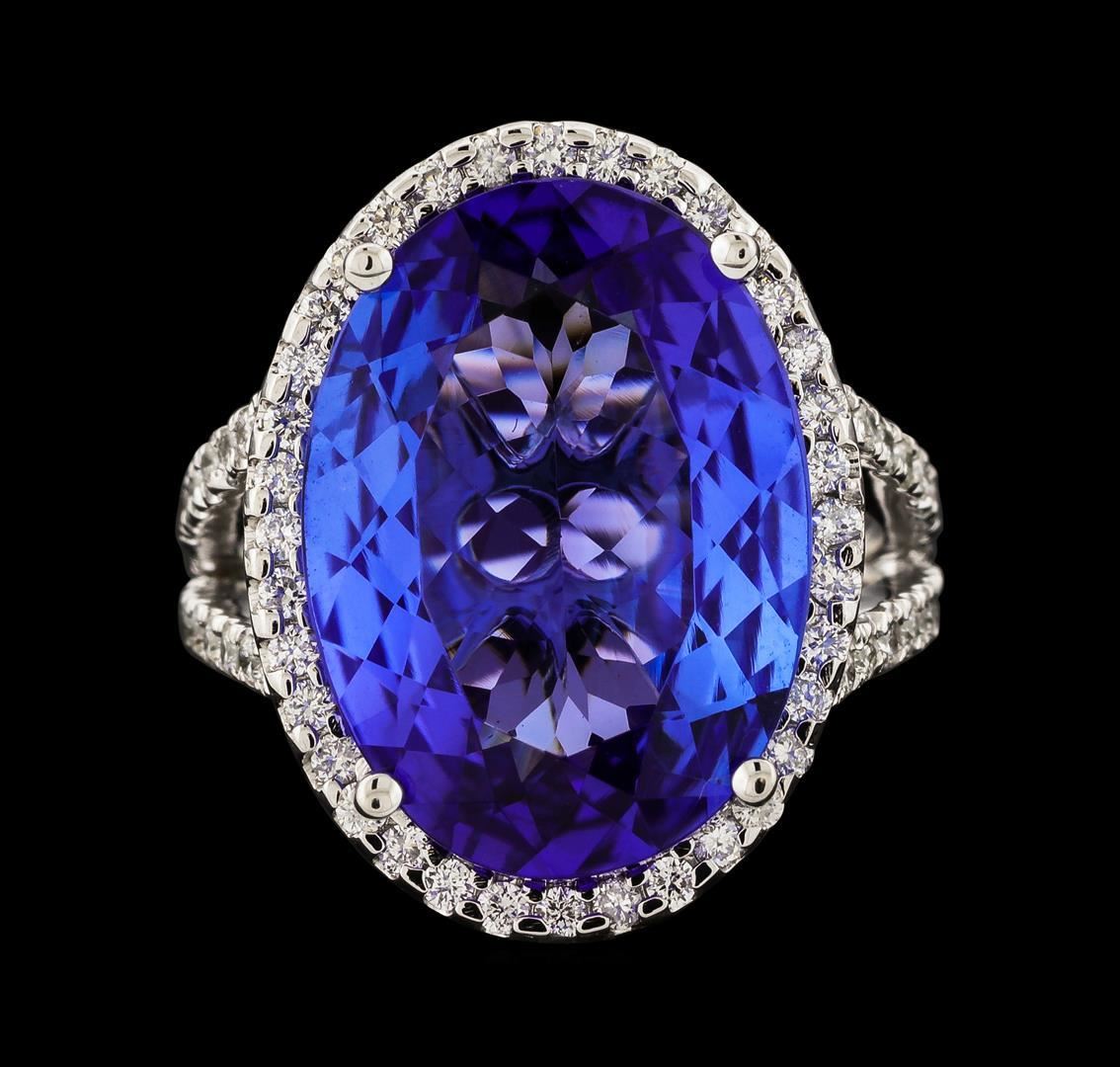 One electronically tested 14KT white gold lady's cast fashion ring with a split cathedral shank with a halo with a bright polish finish. The featured lady's ring has a shank measuring 2.73 millimeters wide. Identified with markings of '14K'. Condition is new, good workmanship. Containing: One prong set oval modified brilliant cut natural tanzanite, measuring 17.55 x 12.71 x 6.40mm, (depth est.) 8%. bulge factor, approximate weight of 10.86ct., clarity is eye clean, medium light, moderately strong, violetish blue color, (GIA vB 4/4), cut is very good. Transmitting light with no distortion, transparent. Colored gemstones are presumed to have been subjected to commonly used enhancement processes. Graded in the setting. Seventy-Six prong set round brilliant cut diamonds, measuring 1.40 - 1.35 x 0.86mm (depth est.) approximate total weight of 76 Stones = 0.76ct. Graded in the setting. Clarity SI-1 to SI-2. Color: G - H Cut Good. Total Weight of Colored Stones 10.86ct.. Total Weight of Diamonds 0.76ct.. Total Weight of Ring 9.10gm. GAS Appraised.