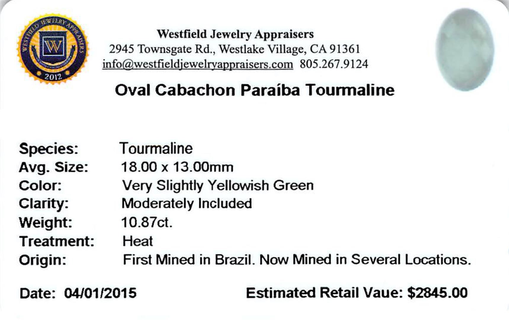 One oval cabochon cut natural Paraiba tourmaline exact weight 10.87ct., clarity is moderately included, cut is good. Westfield Appraised at $2,845.00.