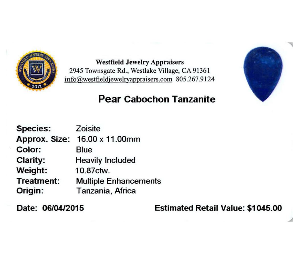 One pear cabochon cut natural tanzanite, measuring 16.00 x 11.00 x 8.00mm, exact weight 10.87ct., clarity is heavily included, type I, dark, moderately strong, blue color, (GIA B 7/4), cut is good. Transmitting light somewhat diffusely, transparent to translucent. Naturally occurring internal & external characteristics are present. Indications of heat treatment. Westfield Appraised at $1,045.00.