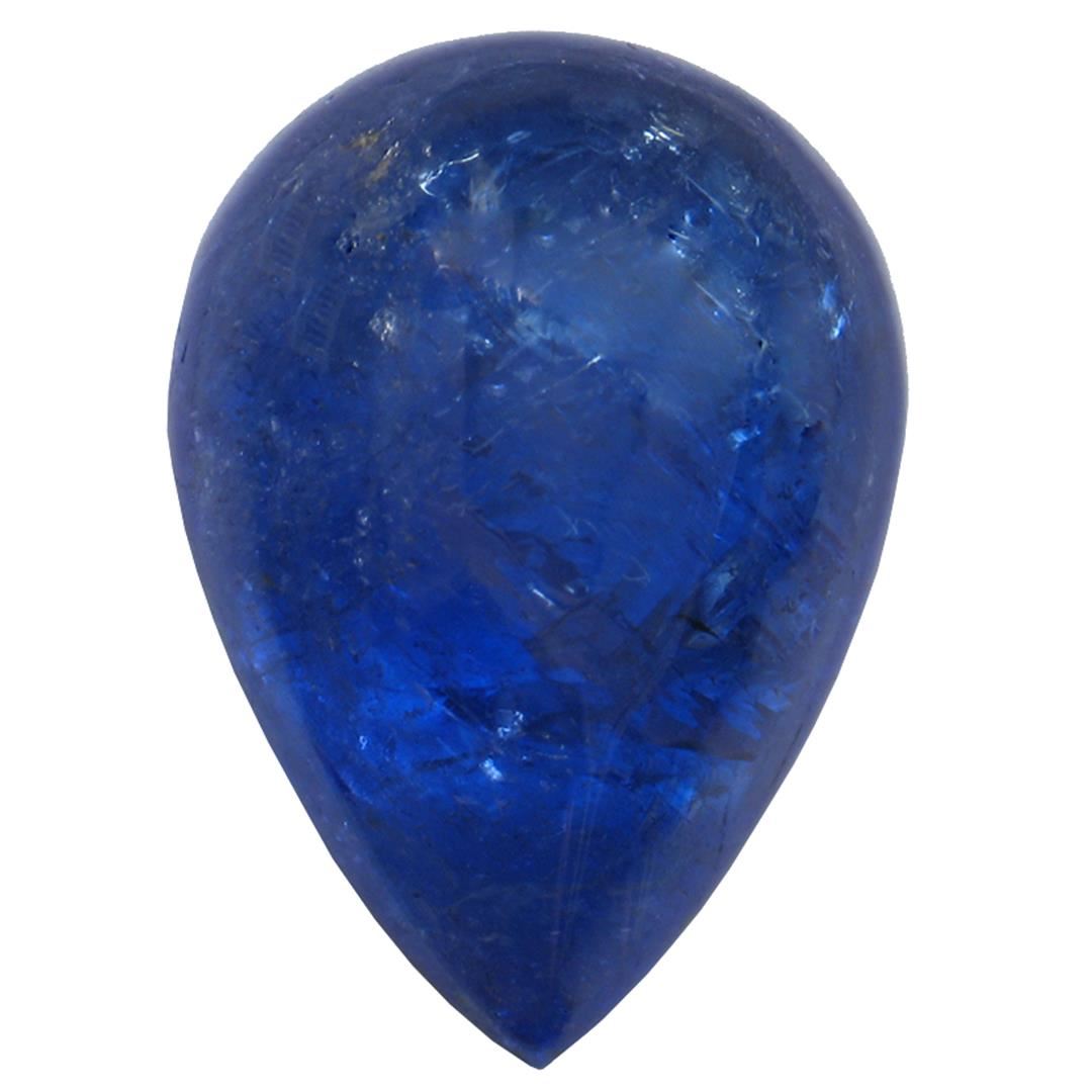 One pear cabochon cut natural tanzanite, measuring 16.00 x 11.00 x 8.00mm, exact weight 10.87ct., clarity is heavily included, type I, dark, moderately strong, blue color, (GIA B 7/4), cut is good. Transmitting light somewhat diffusely, transparent to translucent. Naturally occurring internal & external characteristics are present. Indications of heat treatment. Westfield Appraised at $1,045.00.