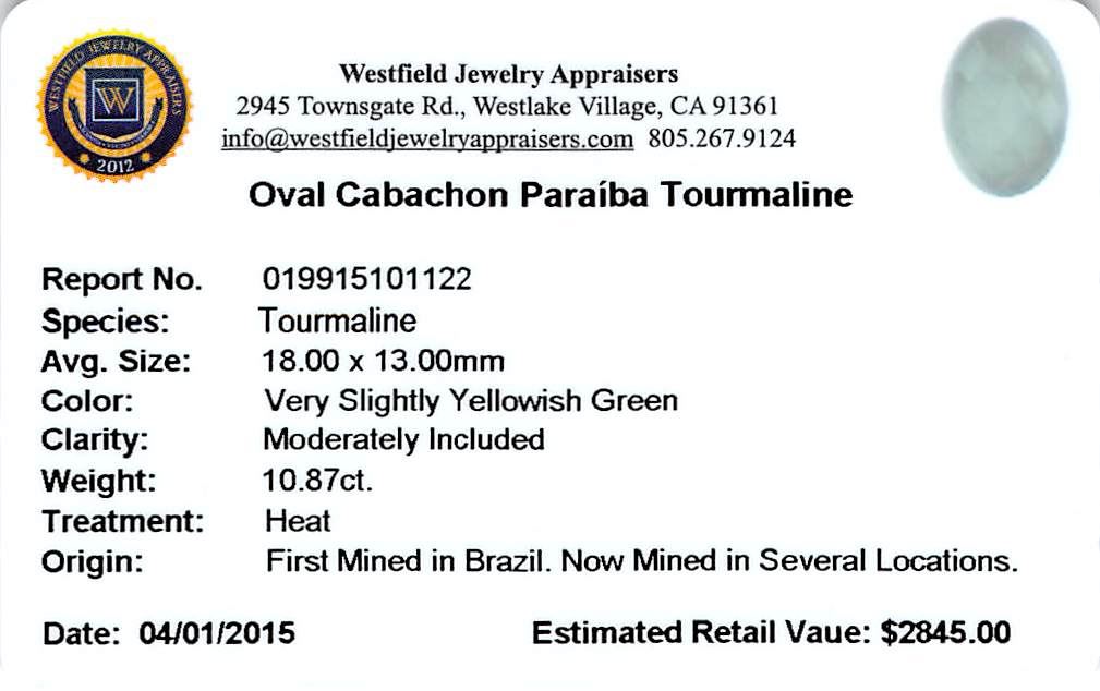 One oval cabochon cut natural Paraiba tourmaline exact weight 10.87ct., clarity is moderately included, cut is good. Westfield Appraised at $2,845.00.