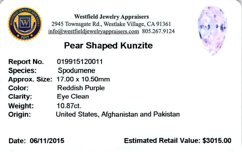 One pear mixed cut natural kunzite, measuring 17.00 x 10.50 x 9.00mm, exact weight 10.87ct., clarity is eye clean, type I, medium light, very slightly grayish, reddish purple color, (GIA rP 4/3), cut is good. Transmitting light with no distortion, transparent. Westfield Appraised at $3,015.00.