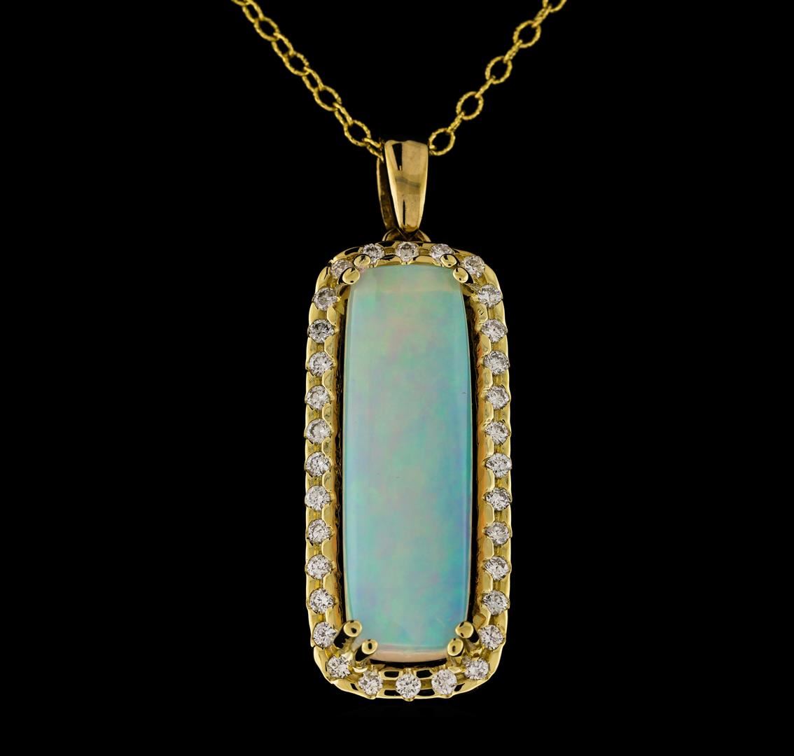 One electronically tested 14KT yellow gold lady's combination cast & assembled fashion pendant & chain 18.0' long, 1.9mm twisted oval shape link with a lobster claw clasp with a halo with a bright polish finish. Identified with markings of '14K 585'. Condition is new, good workmanship. Containing: One crystal opal that is cut in a rectangular cus shaped cabochon and is prong set, measuring 30.80 mm long x 9.79 mm wide, and 5.35 mm thick and the approximate weight is 10.88 carats. The opal has a quite bright, multicolor play of color (fire) in a rolling flashfire pattern; a medium dome; a good cut; no inclusions; consistent in its brightness and pattern; and is not directional. Graded in the setting. Thirty-Two prong set round brilliant cut diamonds, measuring 2.00 - 1.90 x 1.19mm (depth est.) approximate total weight of 32 Stones = 0.88ct. Graded in the setting. Clarity SI-1 to SI-2. Color: G - H Cut Good. Total Weight of Diamonds 0.88ct.. Total Weight of Opals 10.88ct.. Total Weight of Pendant & Chain 14.60gm. GAS Appraised at $7,020.00.
