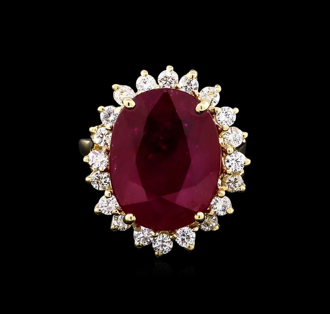 One electronically tested 14KT yellow gold lady's cast fashion ring with a basket halo with a bright polish finish. The featured lady's ring has a shank measuring 1.94 millimeters wide. Identified with markings of "14K". Condition is new, good workmanship. Containing: One prong set oval modified brilliant cut natural ruby, measuring 16.32 x 12.68 x 5.96mm, 5%. bulge factor, approximate weight of 10.88ct., clarity is heavily included, type II, medium dark, moderately strong, red color, (GIA R 6/4), cut is very good. Transmitting light somewhat diffusely, transparent to translucent. Naturally occurring internal & external characteristics are present. Indications of laboratory high temperature heat treatment, with glass & flux additives. Graded in the setting. Twenty prong set round brilliant cut diamonds, measuring 2.40 - 2.30 x 1.46mm (depth est.) approximate total weight of 20 Stones = 0.98ct. Graded in the setting. Clarity: SI-1 to I-1. Color: H - Good. Total Weight of Colored Stones 10.88ct. Total Weight of Diamonds 0.98ct. Total Weight of Ring 8.00gm. GAS Appraised at $7,600.00.