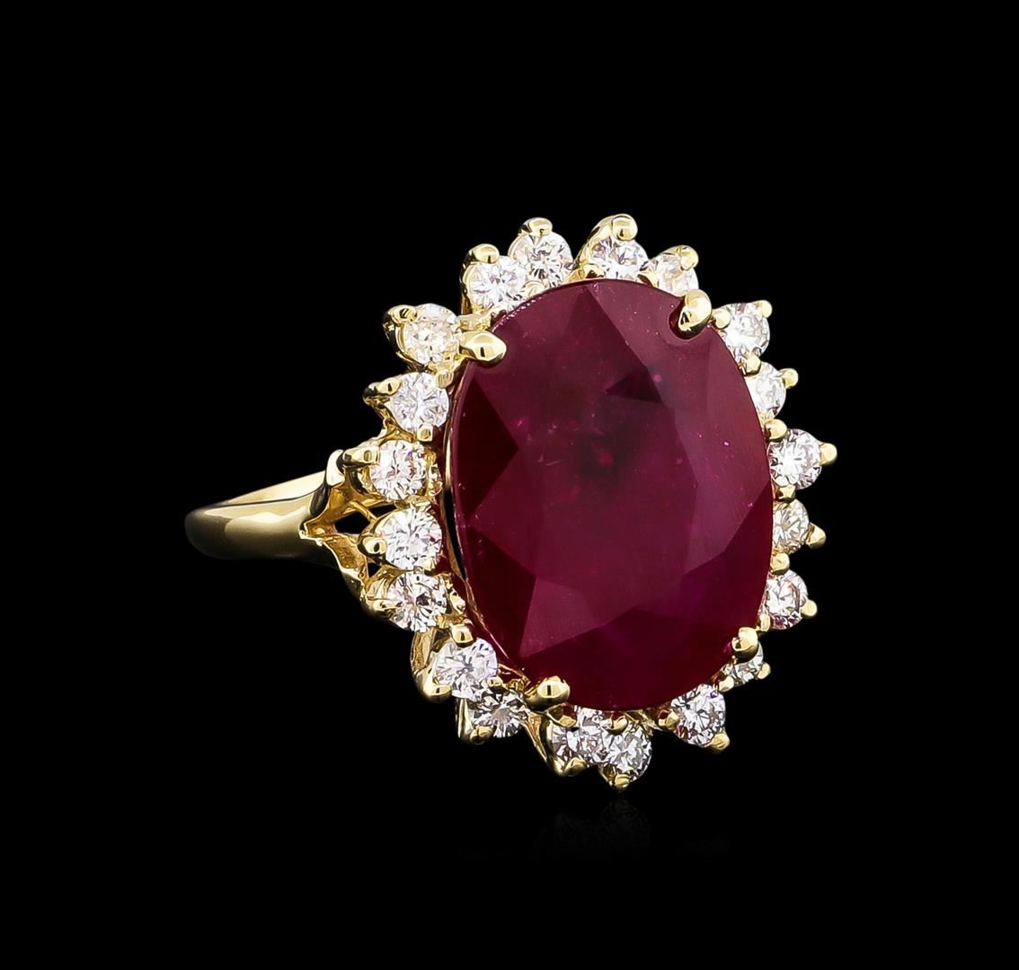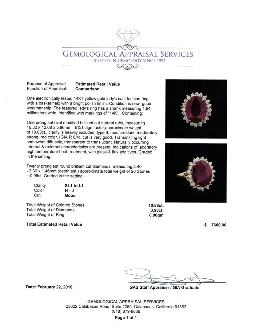 One electronically tested 14KT yellow gold lady's cast fashion ring with a basket halo with a bright polish finish. The featured lady's ring has a shank measuring 1.94 millimeters wide. Identified with markings of "14K". Condition is new, good workmanship. Containing: One prong set oval modified brilliant cut natural ruby, measuring 16.32 x 12.68 x 5.96mm, 5%. bulge factor, approximate weight of 10.88ct., clarity is heavily included, type II, medium dark, moderately strong, red color, (GIA R 6/4), cut is very good. Transmitting light somewhat diffusely, transparent to translucent. Naturally occurring internal & external characteristics are present. Indications of laboratory high temperature heat treatment, with glass & flux additives. Graded in the setting. Twenty prong set round brilliant cut diamonds, measuring 2.40 - 2.30 x 1.46mm (depth est.) approximate total weight of 20 Stones = 0.98ct. Graded in the setting. Clarity: SI-1 to I-1. Color: H - Good. Total Weight of Colored Stones 10.88ct. Total Weight of Diamonds 0.98ct. Total Weight of Ring 8.00gm. GAS Appraised at $7,600.00.