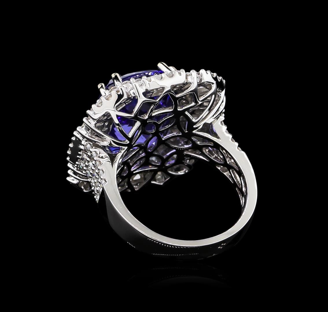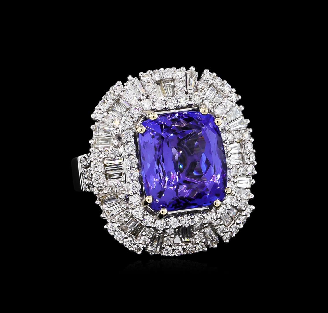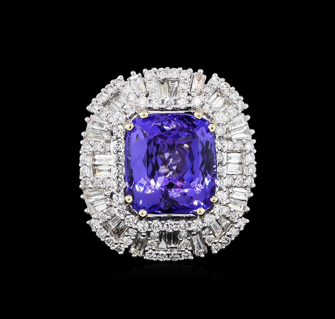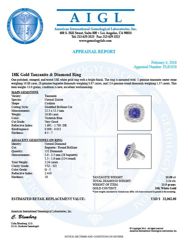 One polished, stamped, and tested 18KT white gold ring with a bright finish. The ring is mounted with: 1 genuine tanzanite center stones weighing 10.88ct, 28 genuine baguette diamonds weighing 0.87ct, and 124 genuine round diamonds weighing 1.37ct. This item weighs 13.00 grams, condition is new, very good workmanship. AIGL Appraised at $32,062.00.