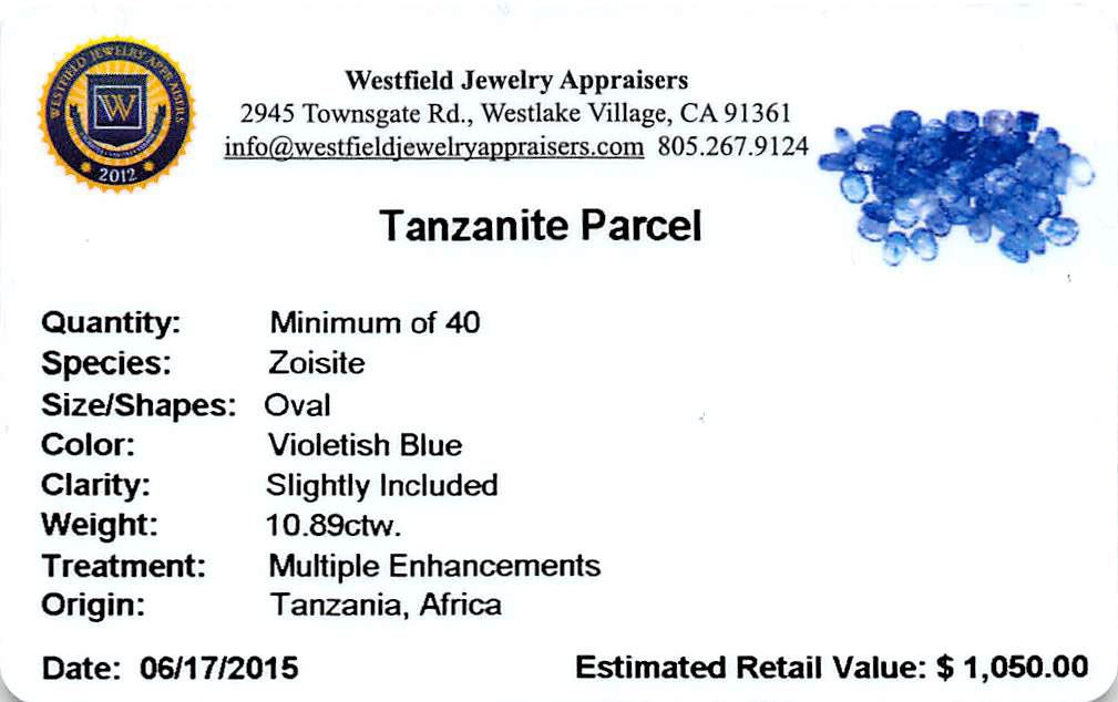 Forty oval mixed cut natural tanzanites exact total weight 10.89ct., clarity is slightly included, type I, medium, very slightly grayish, violetish blue color, (GIA vB 5/3), cut is good. Measurements & the color grade are an average for the group, Color grade is an average for the group, Transmitting light with no distortion, transparent, Indications of laboratory high temperature heat treatment. Westfield Appraised at $1,050.00.