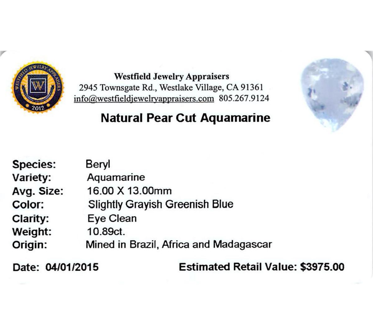 One pear cut natural aquamarine exact weight 10.89ct., clarity is eye clean, type I, medium, slightly grayish, very slightly greenish blue color, (GIA vslgB 5/2), cut is good. Westfield Appraised at $4,195.00.