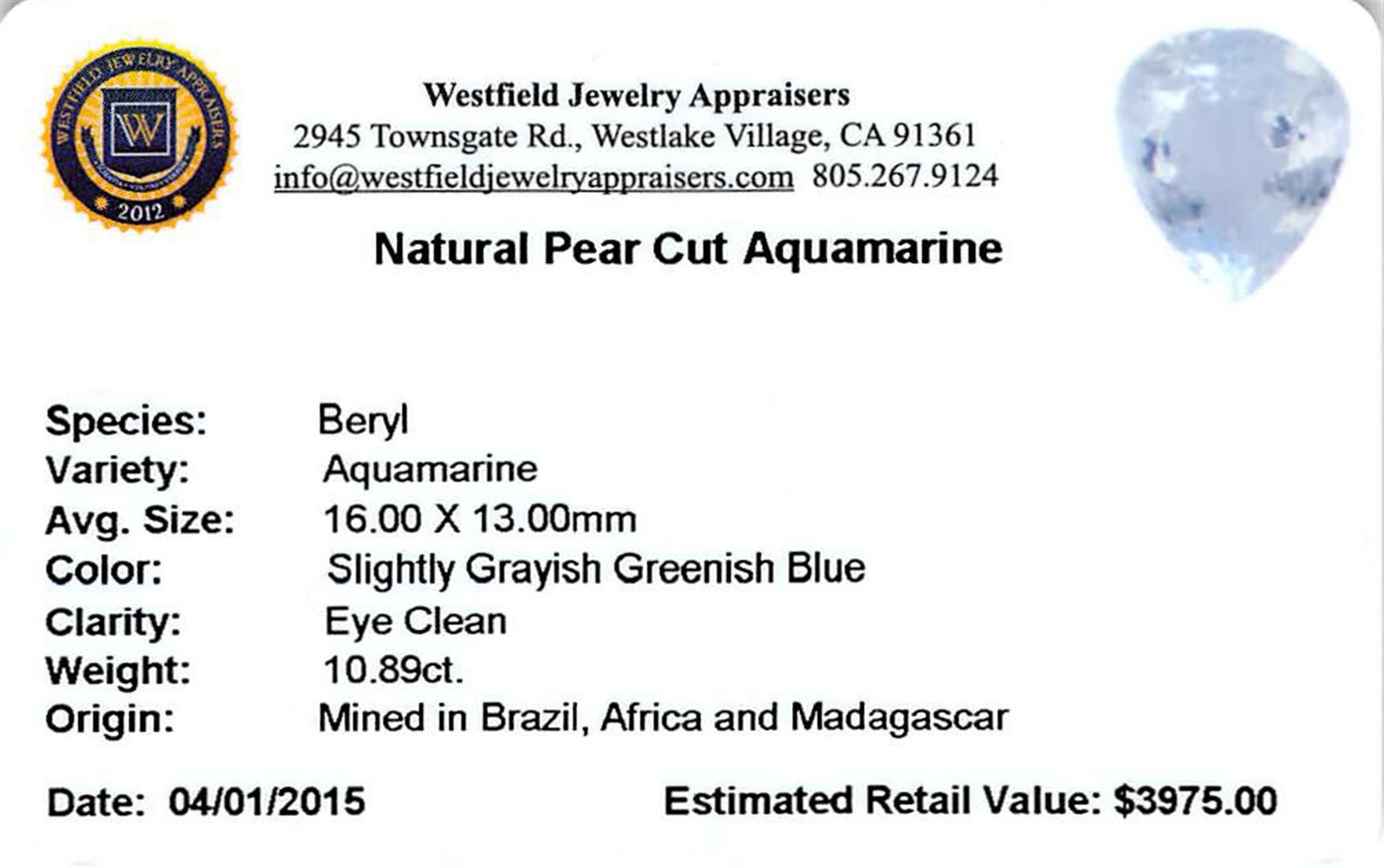 One pear cut natural aquamarine exact weight 10.89ct., clarity is eye clean, type I, medium, slightly grayish, very slightly greenish blue color, (GIA vslgB 5/2), cut is good. Westfield Appraised at $4,195.00.