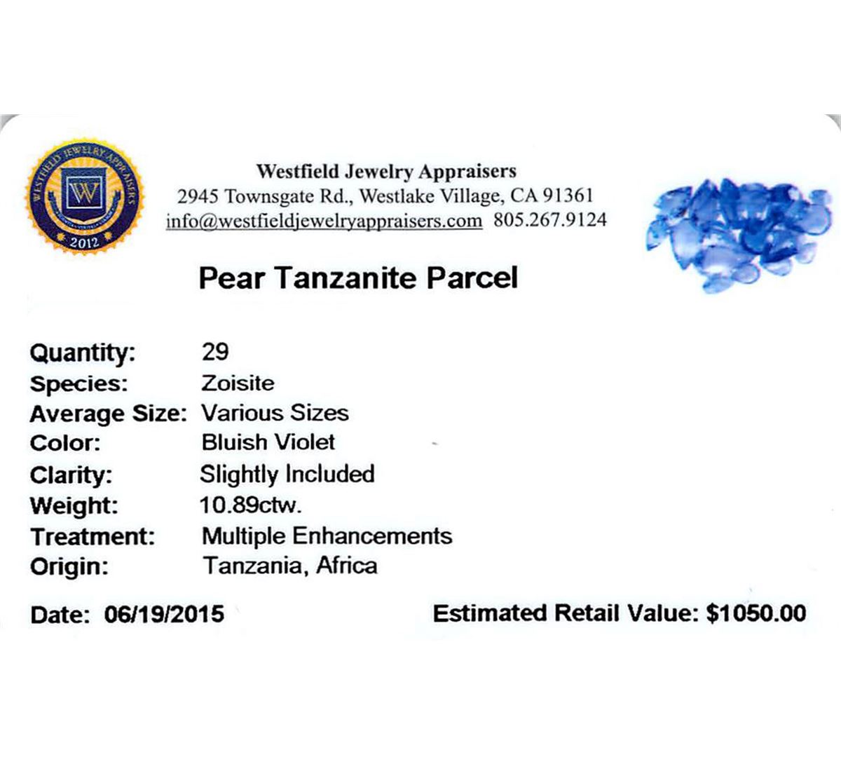 Twenty-nine pear mixed cut natural tanzanites exact total weight 10.89ct., clarity is slightly included, type I, medium dark, very slightly grayish, bluish violet color, (GIA bV 6/3), cut is good. Transmitting light with a minimum of distortion, transparent. Naturally occurring internal & external characteristics are present. Color grade is an average for the group. Tanzanite is a very rare gemstone that is only found in the country of Tanzania. Originally discovered in 1967. Tiffany & Company, named the stone Tanzanite. It is found in the Usumburu Mountains that border the Umba Valley of northern Tanzania. Tanzanite occurs in gray, brown, violet, blue, reddish-purple, & green. The gem is interesting because of its exceptional pleochroism. Rotated in different directions a tanzanite will exhibit multiple changes of color. Tanzanite has a low tolerance to ultrasonic cleaning, and should not be cleaned using this method. Westfield Appraised at $1,050.00.
