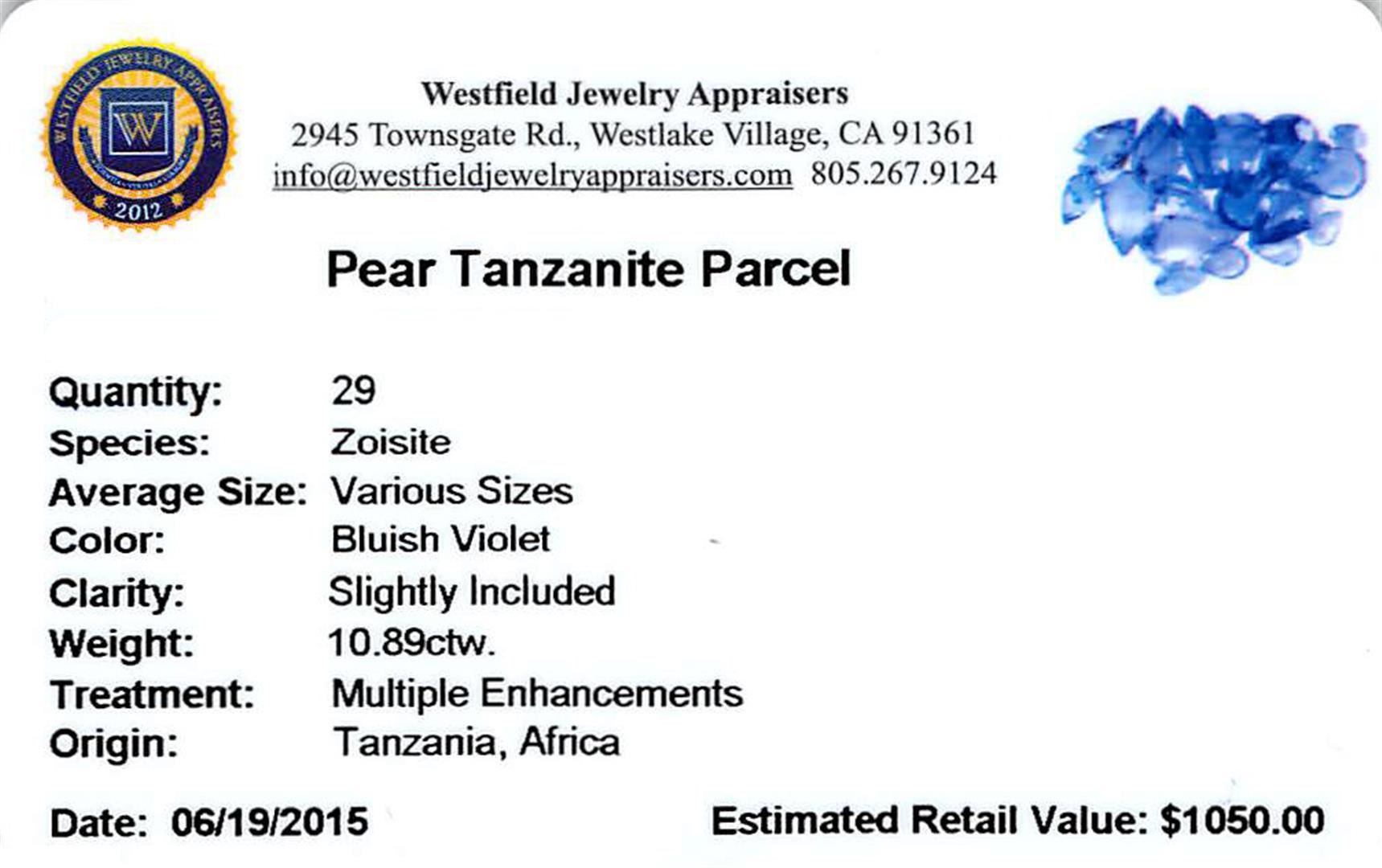 Twenty-nine pear mixed cut natural tanzanites exact total weight 10.89ct., clarity is slightly included, type I, medium dark, very slightly grayish, bluish violet color, (GIA bV 6/3), cut is good. Transmitting light with a minimum of distortion, transparent. Naturally occurring internal & external characteristics are present. Color grade is an average for the group. Tanzanite is a very rare gemstone that is only found in the country of Tanzania. Originally discovered in 1967. Tiffany & Company, named the stone Tanzanite. It is found in the Usumburu Mountains that border the Umba Valley of northern Tanzania. Tanzanite occurs in gray, brown, violet, blue, reddish-purple, & green. The gem is interesting because of its exceptional pleochroism. Rotated in different directions a tanzanite will exhibit multiple changes of color. Tanzanite has a low tolerance to ultrasonic cleaning, and should not be cleaned using this method. Westfield Appraised at $1,050.00.