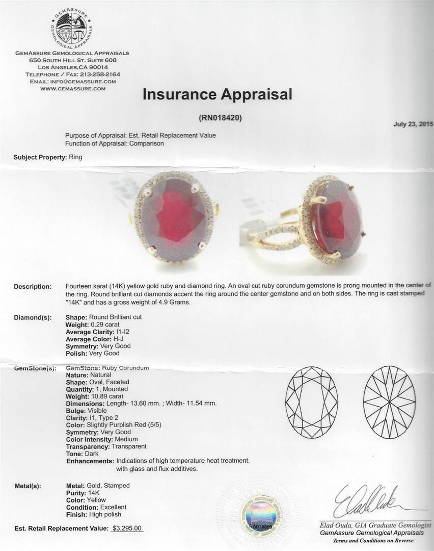 Fourteen karat (14K) yellow gold ruby and diamond ring. An oval cut ruby corundum gemstone is prong mounted in the center of the ring. Round brilliant cut diamonds accent the ring around the center gemstone and on both sides. The ring is cast stamped "14K" and has a gross weight of 4.9 Grams. Diamond(s): Shape: Round Brilliant cut. Weight: 0.29 carat. Average Clarity: I1-I2. Average Color: H-J. Symmetry: Very Good. Polish: Very Good. Gemstone(s): Gemstone: Ruby Corundum. Nature: Natural. Shape: Oval, Faceted. Quantity: 1, Mounted. Weight: 10.89 carat. Dimensions: Length- 13.60 mm. ; Width- 11.54 mm. Bulge: Visible. Clarity: I1, Type 2. Color: Red (5/5). Symmetry: Very Good. Color Intensity: Medium. Transparency: Transparent. Tone: Dark. Enhancements: Indications of high temperature heat treatment, with glass and flux additives. Metal(s): Metal: Gold, Stamped. Purity: 14K. Color: Yellow. Condition: Excellent. Finish: High polish. GGA Appraised at $3,295.00.