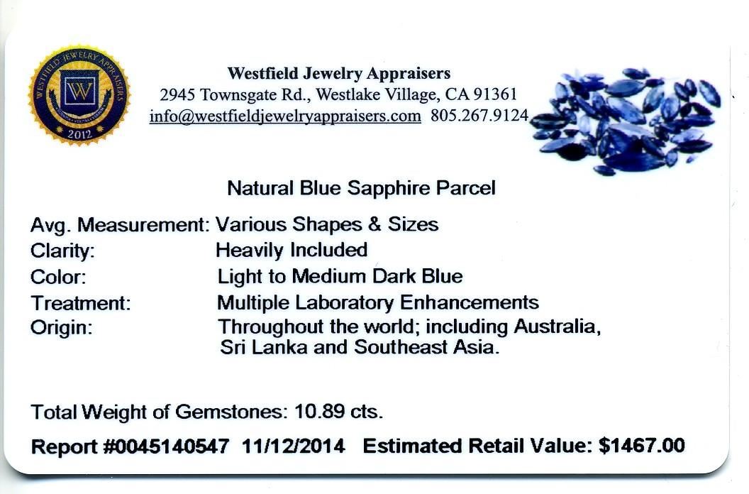 10.89ctw. Natural Blue Sapphire Parcel. Westfield Appraised at $1,467.00.