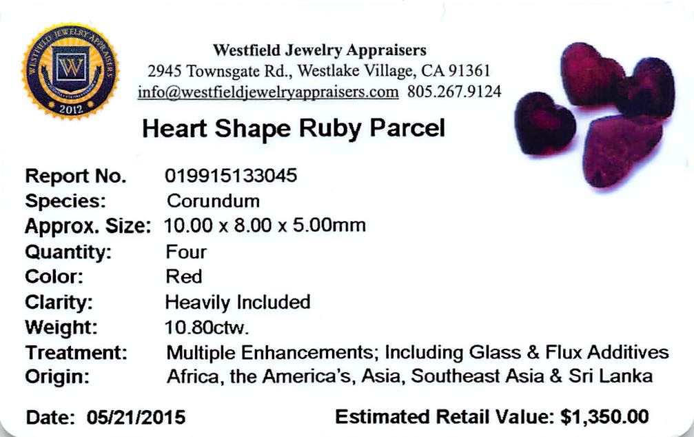Four heart mixed cut natural rubies, measuring 10.00 x 8.00 x 5.00mm, exact total weight 10.80ct., clarity is heavily included, type II, dark, very slightly brownish, red color, (GIA R 7/3), cut is good. Measurements are an average for the group. Transmitting light somewhat diffusely, transparent to translucent. Naturally occurring internal & external characteristics are present. Indications of laboratory high temperature heat treatment, with glass & flux additives. Ruby has a low tolerance to rhodium plating, repolishing the surface, & ultrasonic cleaning. Westfield Appraised at $1,350.00.