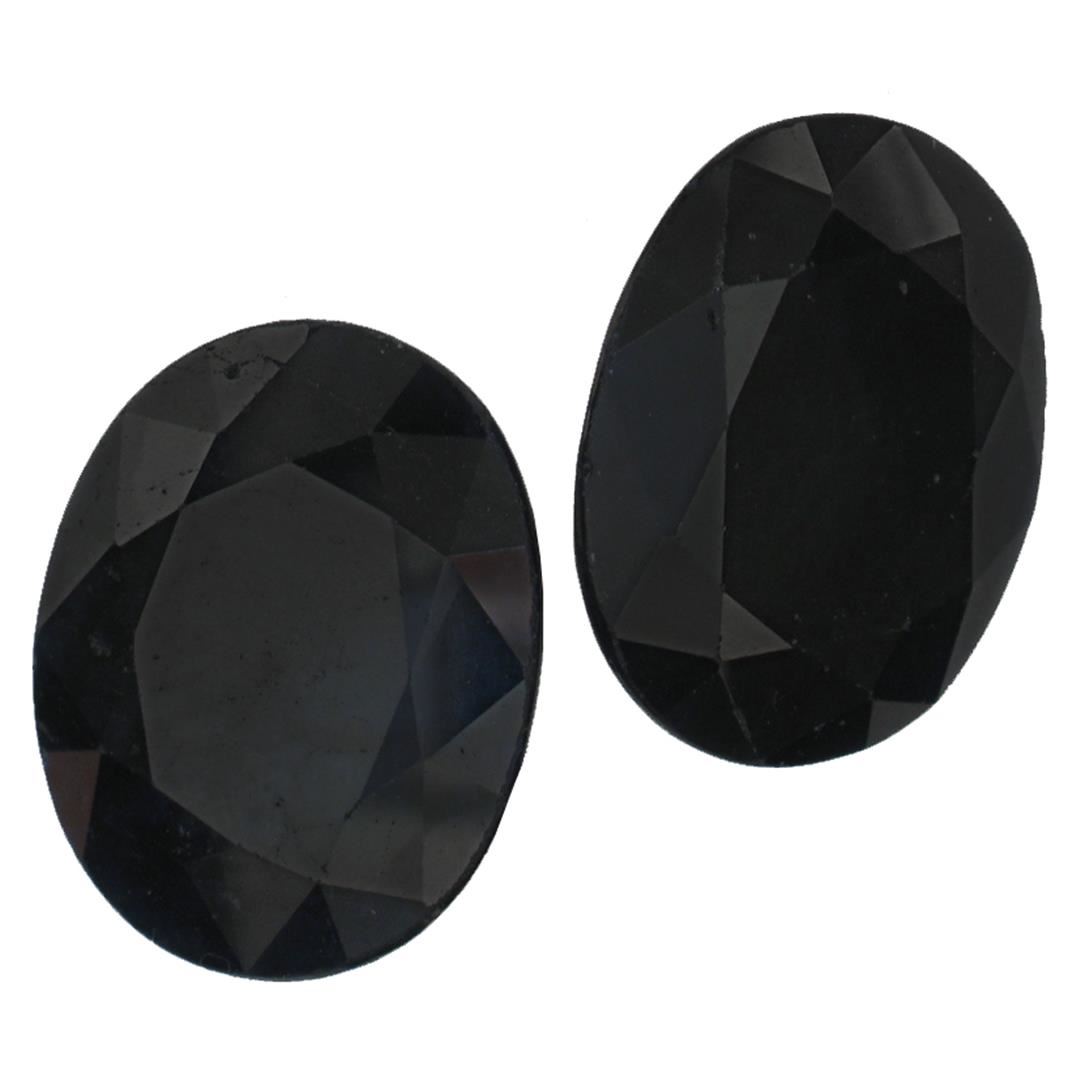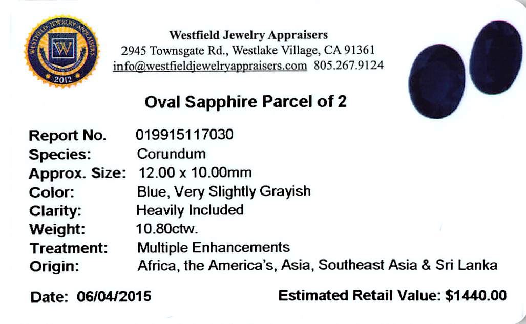 Two oval mixed cut natural blue sapphires, measuring 12.00 x 10.00 x 6.00mm, exact total weight 10.80ct., clarity is heavily included, type II, very dark, very slightly grayish, blue color, (GIA B 8/3), cut is good. Measurements are an average for the Westfield Appraised at $1,440.00.