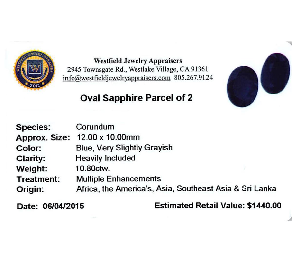 Two oval mixed cut natural blue sapphires, measuring 12.00 x 10.00 x 6.00mm, exact total weight 10.80ct., clarity is heavily included, type II, very dark, very slightly grayish, blue color, (GIA B 8/3), cut is good. Measurements are an average for the pair. Transmitting light very diffusely, opaque. Naturally occurring internal & external characteristics are present. Indications of multiple laboratory enhancements, including high temperature heat treatment. UGS Appraised at $1,440.00.
