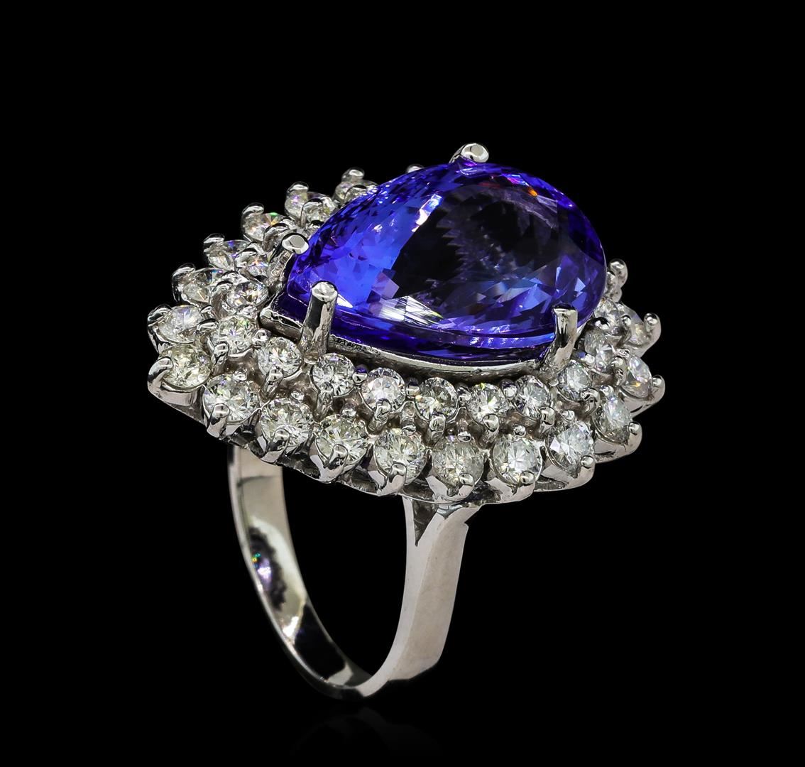 One electronically tested 14KT white gold ladies cast tanzanite and diamond ring with a bright polish finish. The featured tanzanite is set within a tiered diamond floret supported by a lattice under gallery, completed by a two millimeter wide band. Identified with markings of 'K14'. Condition is new, good workmanship. Containing: One prong set pear mixed cut natural tanzanite, measuring 17.50 x 11.20 x 8.30mm, approximate weight of 10.90ct., clarity is eye clean, type I, medium, very slightly grayish, bluish violet color, (GIA bV 5/3), cut is good. Transmitting light with no distortion, transparent. Colored Stone Grading Report attached. Graded in the setting. Tanzanite is a very rare gemstone that is only found in the country of Tanzania. Originally discovered in 1967. Tiffany & Company, named the stone Tanzanite. It is found in the Usumburu Mountains that border the Umba Valley of northern Tanzania. Tanzanite occurs in gray, brown, violet, blue, reddish-purple, & green. The gem is interesting because of its exceptional pleochroism. Rotated in different directions a tanzanite will exhibit multiple changes of color. Tanzanite has a low tolerance to ultrasonic cleaning, and should not be cleaned using this method. Twenty-One prong set round brilliant cut diamonds, measuring 2.70 - 2.60 x 1.59mm (depth est.) approximate total weight of 21 Stones = 1.48ct. Graded in the setting. Clarity SI-2 to I-2. Color: F - H Twenty prong set round brilliant cut diamonds, measuring 2.20 - 2.20 x 1.32mm (depth est.) approximate total weight of 20 Stones = 0.83ct. Graded in the setting. Clarity SI-2 to I-2. Color: F - H. Total Weight of Colored Stones 10.90ct.. Total Weight of Diamonds 2.31ct.. Total Weight of Ring 12.73gm. AIG Appraised at $30,200.00.