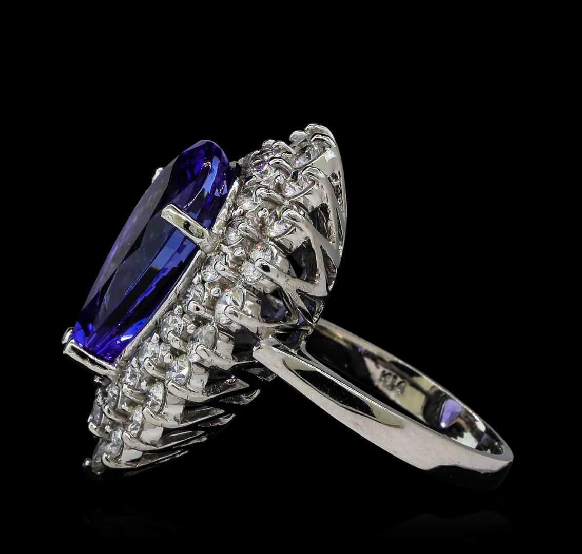One electronically tested 14KT white gold ladies cast tanzanite and diamond ring with a bright polish finish. The featured tanzanite is set within a tiered diamond floret supported by a lattice under gallery, completed by a two millimeter wide band. Identified with markings of 'K14'. Condition is new, good workmanship. Containing: One prong set pear mixed cut natural tanzanite, measuring 17.50 x 11.20 x 8.30mm, approximate weight of 10.90ct., clarity is eye clean, type I, medium, very slightly grayish, bluish violet color, (GIA bV 5/3), cut is good. Transmitting light with no distortion, transparent. Colored Stone Grading Report attached. Graded in the setting. Tanzanite is a very rare gemstone that is only found in the country of Tanzania. Originally discovered in 1967. Tiffany & Company, named the stone Tanzanite. It is found in the Usumburu Mountains that border the Umba Valley of northern Tanzania. Tanzanite occurs in gray, brown, violet, blue, reddish-purple, & green. The gem is interesting because of its exceptional pleochroism. Rotated in different directions a tanzanite will exhibit multiple changes of color. Tanzanite has a low tolerance to ultrasonic cleaning, and should not be cleaned using this method. Twenty-One prong set round brilliant cut diamonds, measuring 2.70 - 2.60 x 1.59mm (depth est.) approximate total weight of 21 Stones = 1.48ct. Graded in the setting. Clarity SI-2 to I-2. Color: F - H Twenty prong set round brilliant cut diamonds, measuring 2.20 - 2.20 x 1.32mm (depth est.) approximate total weight of 20 Stones = 0.83ct. Graded in the setting. Clarity SI-2 to I-2. Color: F - H. Total Weight of Colored Stones 10.90ct.. Total Weight of Diamonds 2.31ct.. Total Weight of Ring 12.73gm. AIG Appraised at $30,200.00.