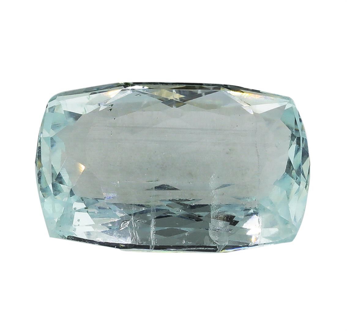 One natural cushion cut aquamarine with an exact weight of 10.92ct., clarity is slightly included, slightly grayish greenish blue, light. Gemological Appraisals Services estimates the retail value at $4204.2 GAS Appraised.