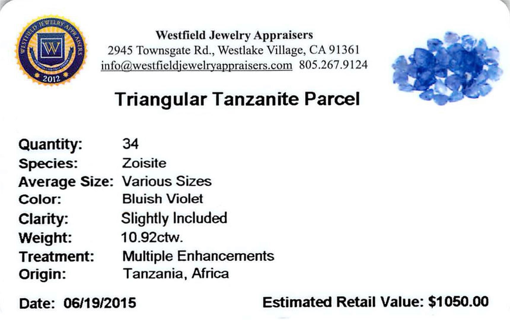 Thirty-four triangle mixed cut natural tanzanites exact total weight 10.92ct., clarity is slightly included, type I, medium dark, very slightly grayish, bluish violet color, (GIA bV 6/3), cut is good. Transmitting light with a minimum of distortion, transparent. Naturally occurring internal & external characteristics are present. Color grade is an average for the group. Tanzanite is a very rare gemstone that is only found in the country of Tanzania. Originally discovered in 1967. Tiffany & Company, named the stone Tanzanite. It is found in the Usumburu Mountains that border the Umba Valley of northern Tanzania. Tanzanite occurs in gray, brown, violet, blue, reddish-purple, & green. The gem is interesting because of its exceptional pleochroism. Rotated in different directions a tanzanite will exhibit multiple changes of color. Tanzanite has a low tolerance to ultrasonic cleaning, and should not be cleaned using this method. Westfield Appraised at $1,050.00.