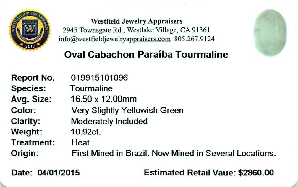 One oval cabochon cut natural Paraiba tourmaline exact weight 10.92ct., clarity is moderately included, cut is good. Westfield Appraised at $2,860.00.