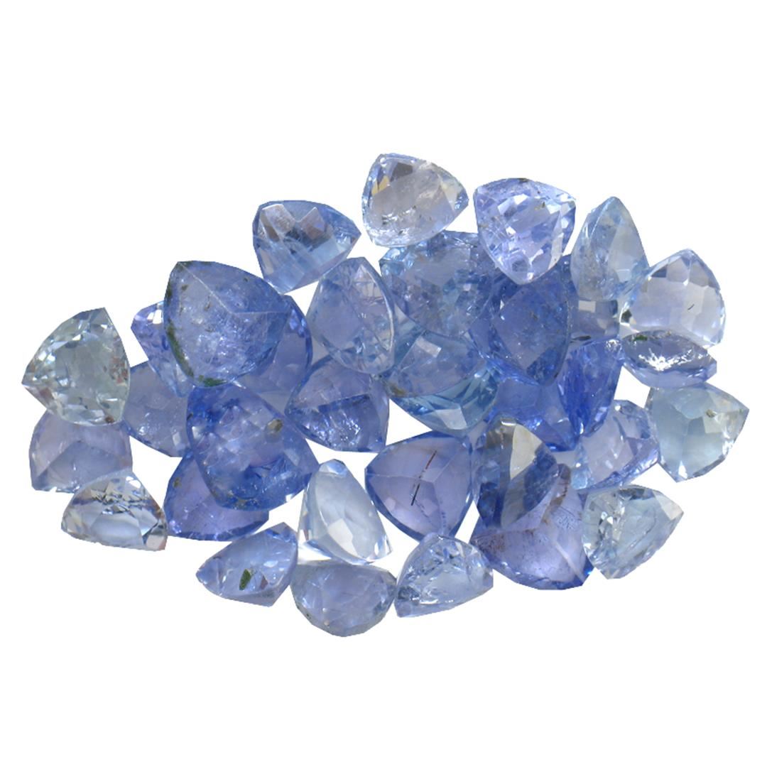 Thirty-four triangle mixed cut natural tanzanites exact total weight 10.92ct., clarity is slightly included, type I, medium dark, very slightly grayish, bluish violet color, (GIA bV 6/3), cut is good. Transmitting light with a minimum of distortion, tr Westfield Appraised at $1,050.00.