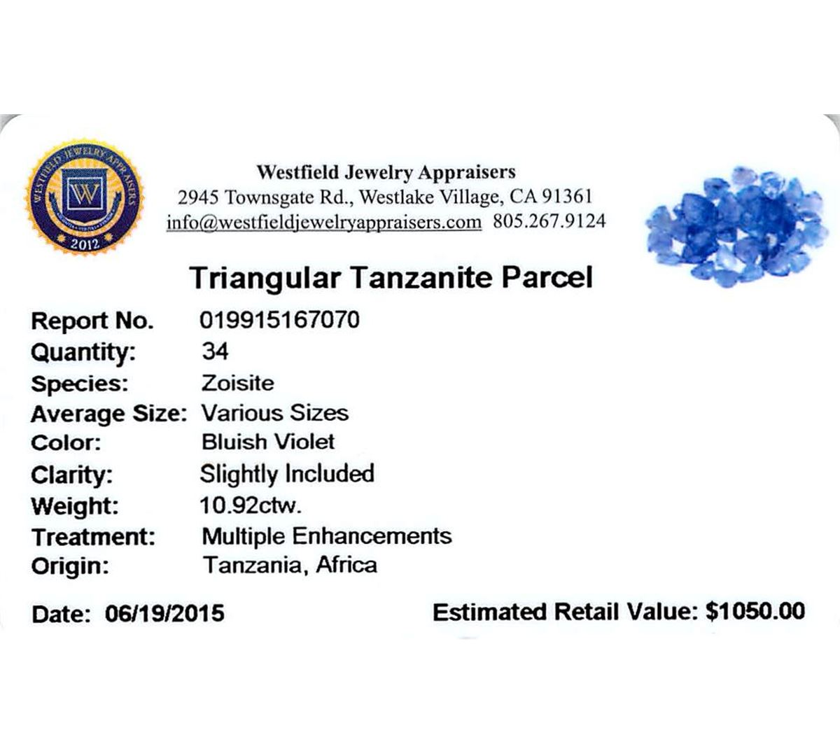 Thirty-four triangle mixed cut natural tanzanites exact total weight 10.92ct., clarity is slightly included, type I, medium dark, very slightly grayish, bluish violet color, (GIA bV 6/3), cut is good. Transmitting light with a minimum of distortion, transparent. Naturally occurring internal & external characteristics are present. Color grade is an average for the group. Tanzanite is a very rare gemstone that is only found in the country of Tanzania. Originally discovered in 1967. Tiffany & Company, named the stone Tanzanite. It is found in the Usumburu Mountains that border the Umba Valley of northern Tanzania. Tanzanite occurs in gray, brown, violet, blue, reddish-purple, & green. The gem is interesting because of its exceptional pleochroism. Rotated in different directions a tanzanite will exhibit multiple changes of color. Tanzanite has a low tolerance to ultrasonic cleaning, and should not be cleaned using this method. Westfield Appraised at $1,050.00.