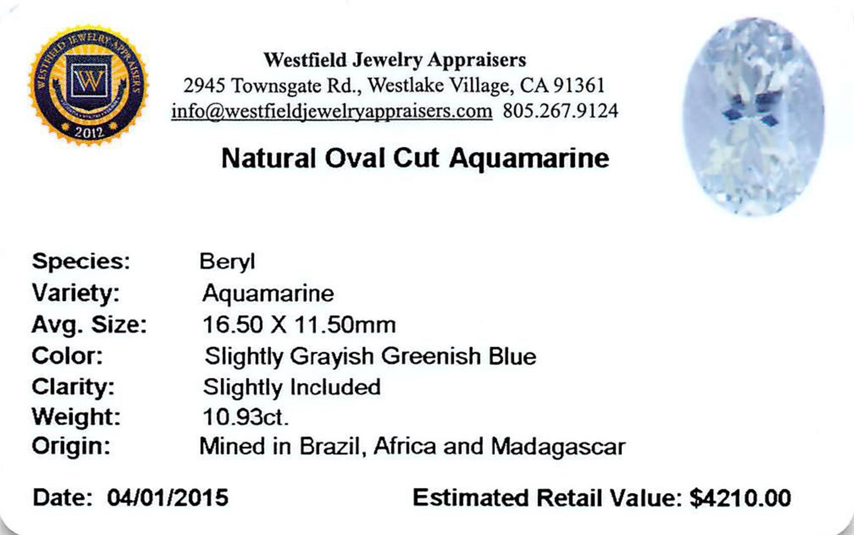One oval cut natural aquamarine exact weight 10.93ct., clarity is slightly included, type I, medium light, slightly grayish, very slightly greenish blue color, (GIA vslgB 4/2), cut is good. Westfield Appraised at $4,210.00.