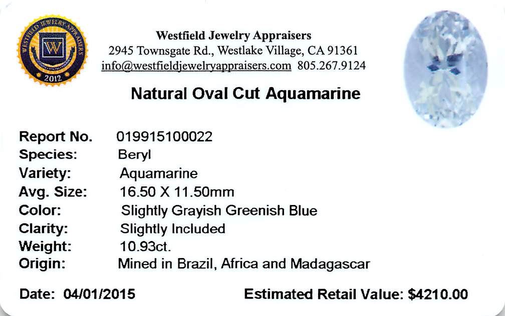 One oval cut natural aquamarine exact weight 10.93ct., clarity is slightly included, type I, medium light, slightly grayish, very slightly greenish blue color, (GIA vslgB 4/2), cut is good. Westfield Appraised at $4,210.00.