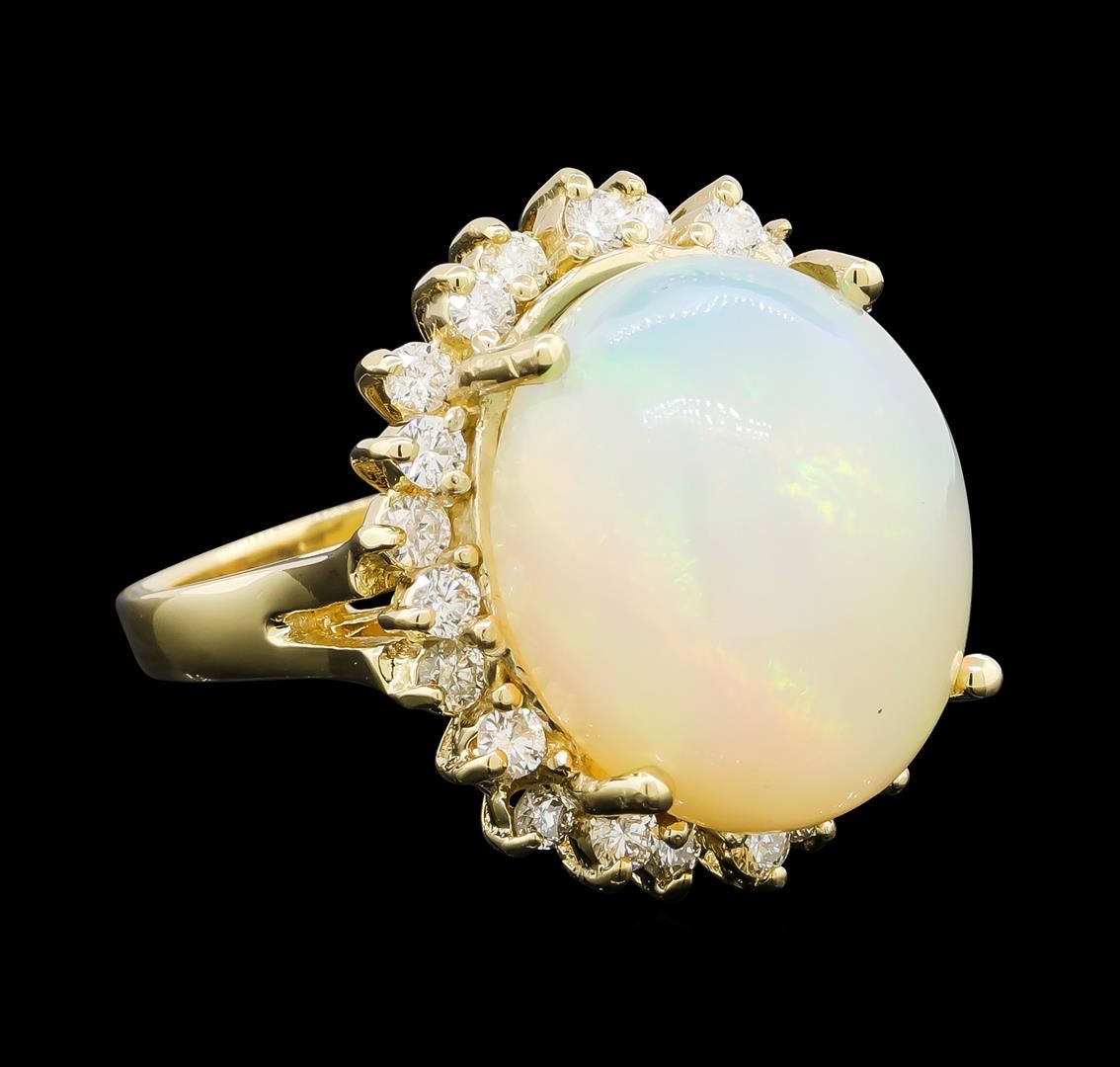 One electronically tested 14KT yellow gold lady's cast fashion ring with a staggered basket halo with a bright polish finish. The featured lady's ring has a shank measuring 2.44 millimeters wide. Identified with markings of '14K'. Condition is new, good workmanship. Containing: One crystal opal that is cut in a oval shaped cabochon and is prong set, measuring 16.73 mm long x 14.04 mm wide, and 10.06 mm thick and the approximate weight is 10.95 carats. The opal has a somewhat bright, multicolor play of color (fire) in a rolling flashfire pattern; a high dome; a good cut; no inclusions; slight variation in base in its brightness and pattern; and is not directional. Graded in the setting. Twenty-Four prong set round brilliant cut diamonds, measuring 2.10 - 2.05 x 1.27mm (depth est.) approximate total weight of 24 Stones = 0.80ct. Graded in the setting. Clarity SI-1 to I-1. Color: H - I Cut Good. Total Weight of Diamonds 0.80ct.. Total Weight of Opals 10.95ct.. Total Weight of Ring 7.20gm. GAS Appraised at $4,940.00.
