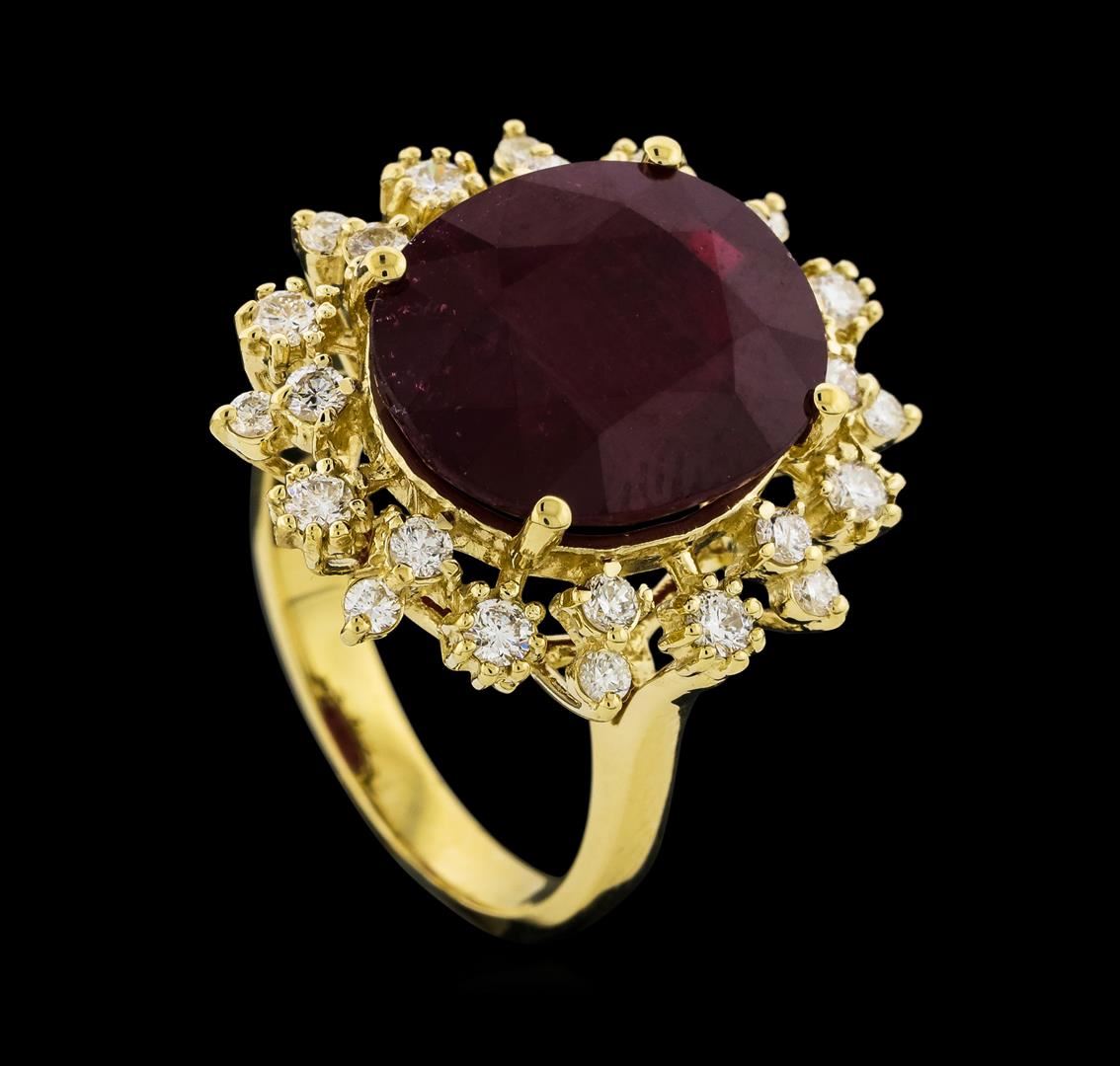 One Ruby and Diamond Ring featuring: 14KT Yellow Gold with a total weight of 5.86 grams, Ruby with a total weight of 10.95ct, and 24 diamonds with a total weight of 0.60ctw.