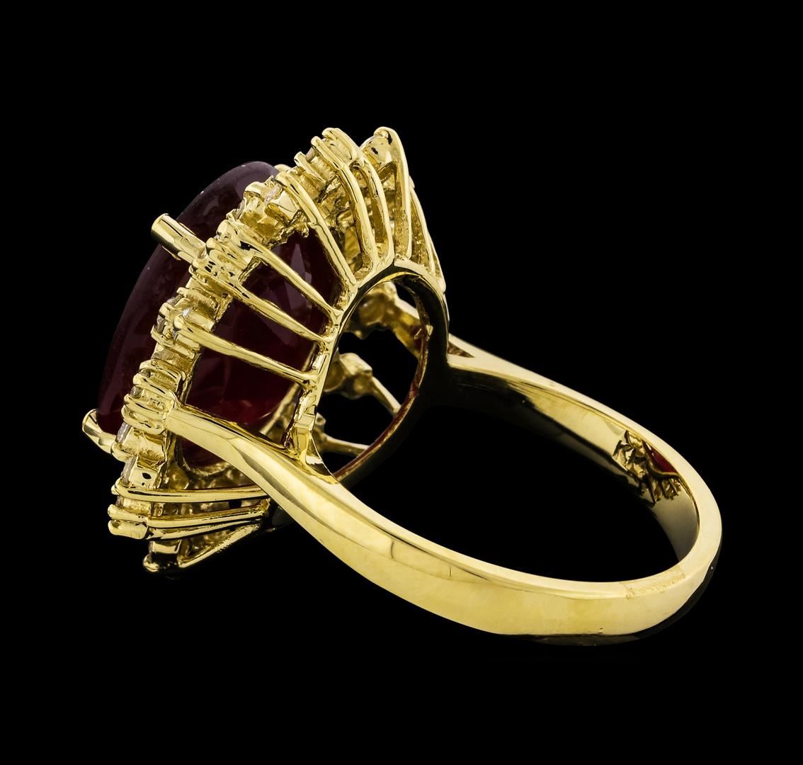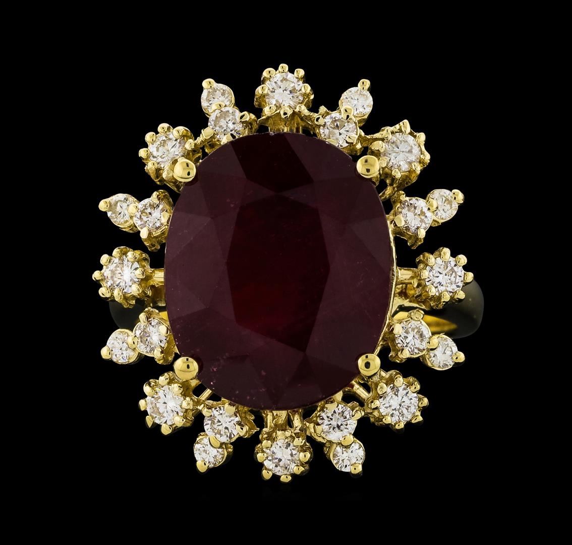 One Ruby and Diamond Ring featuring: 14KT Yellow Gold with a total weight of 5.86 grams, Ruby with a total weight of 10.95ct, and 24 diamonds with a total weight of 0.60ctw.